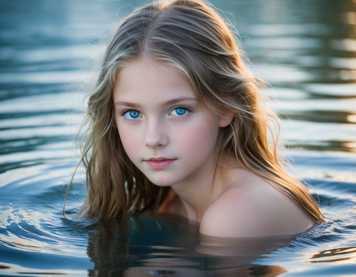 A woman with wet hair emerges from blue water, her captivating gaze fixed on the viewer against a softly blurred background.