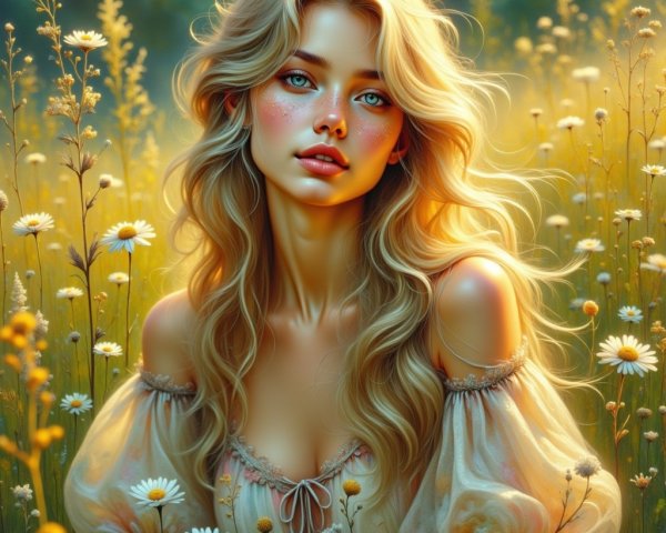 A serene woman in an ornate orange gown with floral details stands amidst blossoming cherry trees and elegant vases, embodying a harmonious blend of nature and artistry.