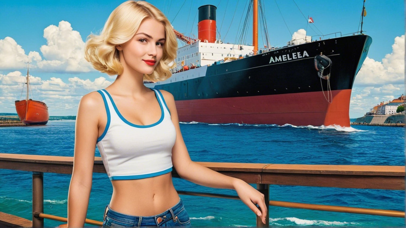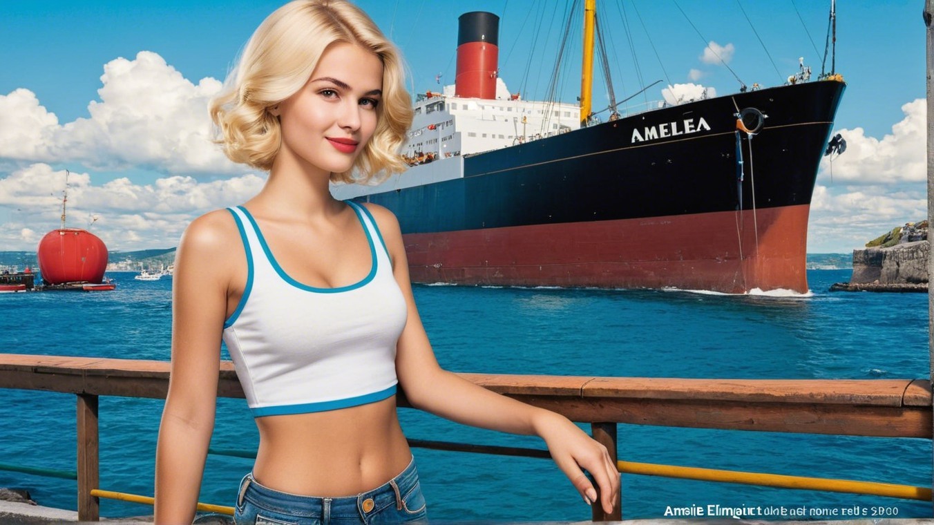A young woman with blonde hair poses confidently near a dock. Behind her, a large ship named "AMELEA" is anchored, set against a bright blue sky and calm waters.