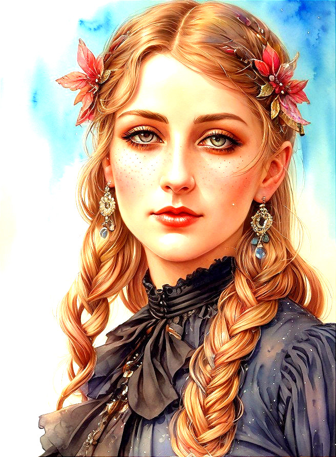 Watercolor and ink portraiture, beautiful female temptress in edwardian garment, earth tones, crackles, crochets, contraptions, detailed hairdo with braids, realistic devilish eyes, dynamic lighting 1.7, gouache paint, grunge, contrast, High coloring, detailed close-up portrait, stylized face, watery alcoholic painture and ink, dots and flares and splashes, soft edges, back-lit, triadic color scheme auburn beige mauve, beige lighting, brushed paint, style of speed art, wet on wet painting, hues, gothical, retrofuturistic details, impasto art, chiaroscuro lighting, ambient occlusion 1.5, shadow mapping 1.3, 3d effects 1.8, intricate stylized hairstyle, brightness 1.7, stylized zentangle lines, abstract, coherent, hues, eerie, occult, retropunk, sweaty, occult, Anglocore 1.9, auracore, high coloring 1.9, mosscore 1.7, cottagegore 1.3, retrofuturistic details of ornamental features, maximalism, radiance, knife oil cuts, brightness 1.4, art nouveau illustration, Kinky Pop Surrealism, illustration on old paper, tints of Edward Hopper, 3d effects 1.8, shadow mapping 1.3, dynamic lighting 1.7, ambient occlusion 1.5, anisotropic filtering 1.9, raytraced shadows, ethereal, otherworldly, abstract style 1.7, hues, grain, blurry aura, fantasy movie still, synthetic essence, raytraced shadows, dark fantasy art, cottagegore 1.7, octane render illustration 1.5, subsurface scattering 1.7, high coloring 1.9, tints of 1970s advertising art and Margaret Keane
