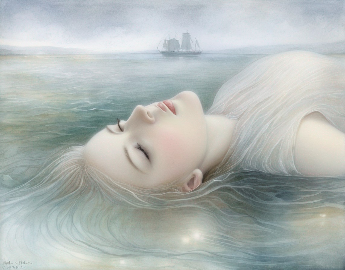 A serene woman with a gentle expression, enveloped in flowing cloth, blending with soft, cloud-like waves in a tranquil, dreamy seascape.