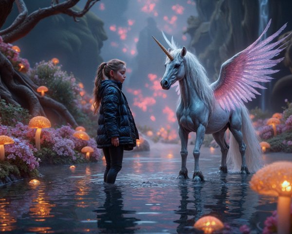 A mystical scene depicts a young woman gently touching the muzzle of a majestic unicorn amidst a field of colorful flowers, bathed in ethereal light, capturing a moment of enchantment and connection.