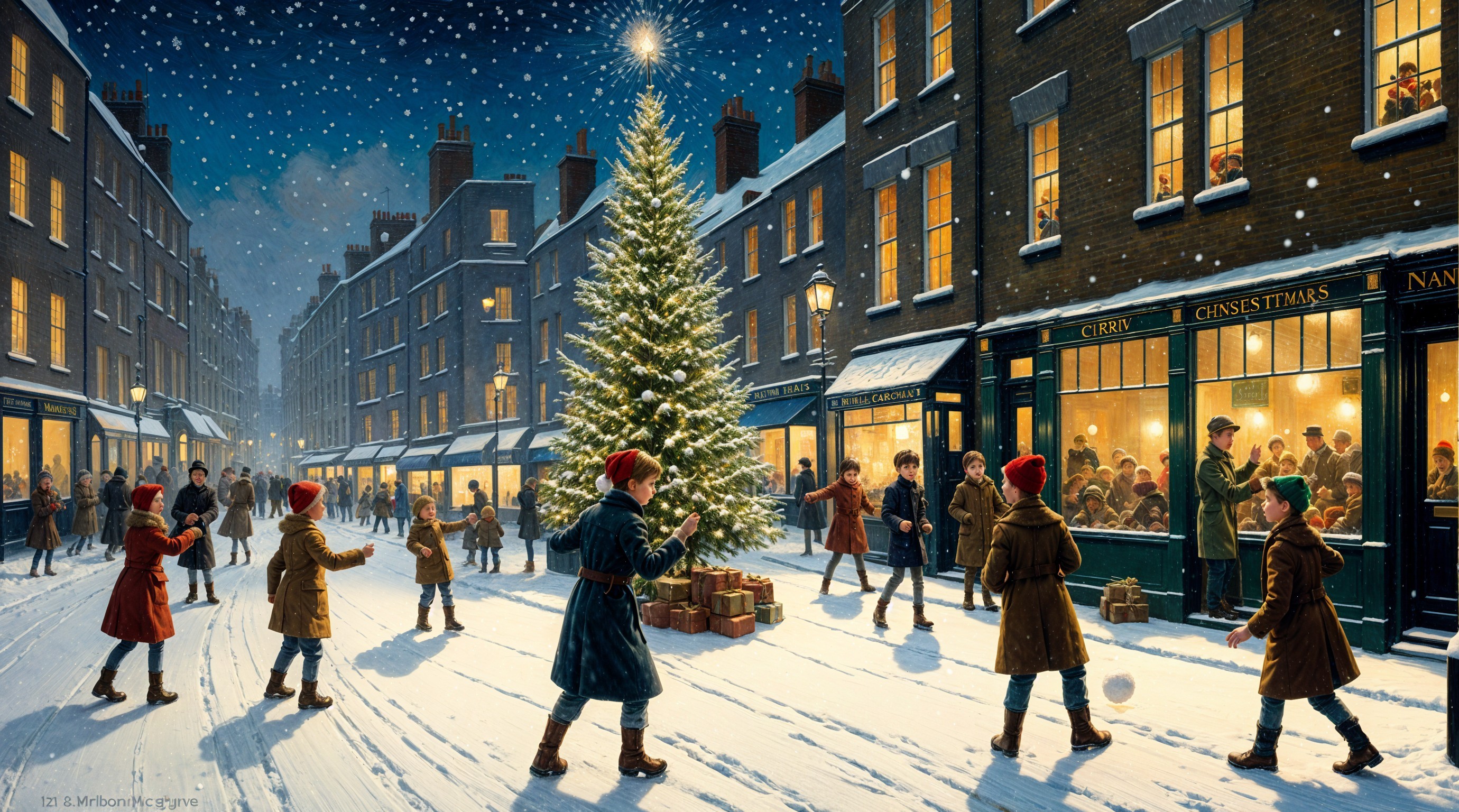 A snowy street scene depicts children playing in front of festive shops adorned with lights. A beautifully decorated Christmas tree stands tall, creating a warm, joyful atmosphere.