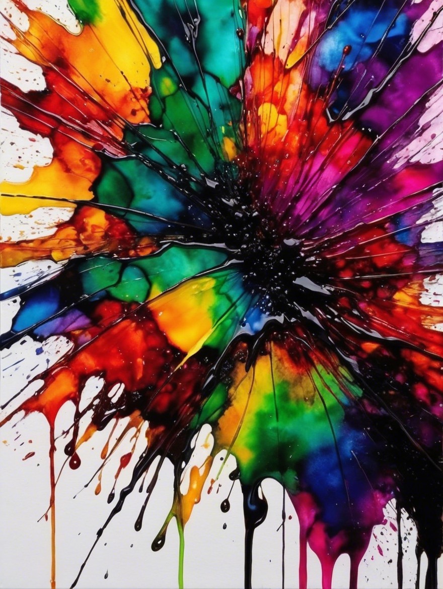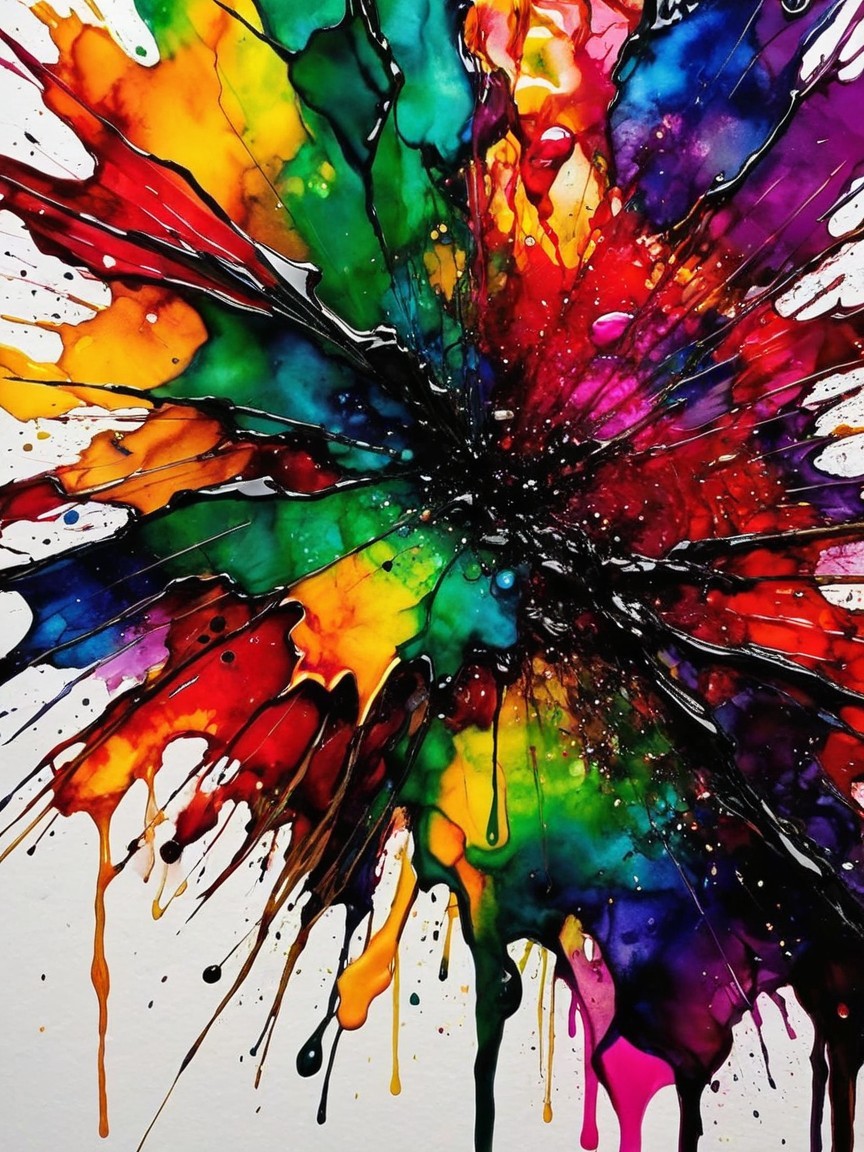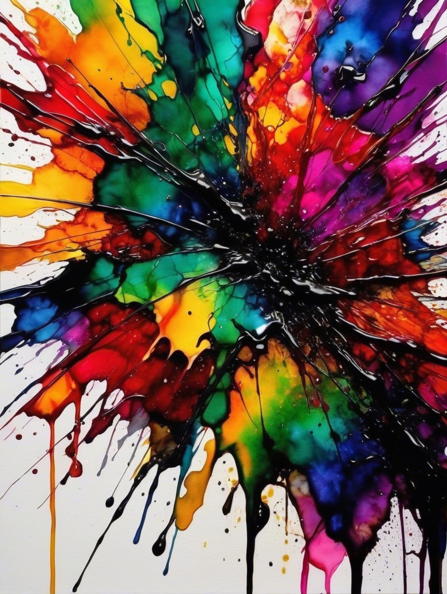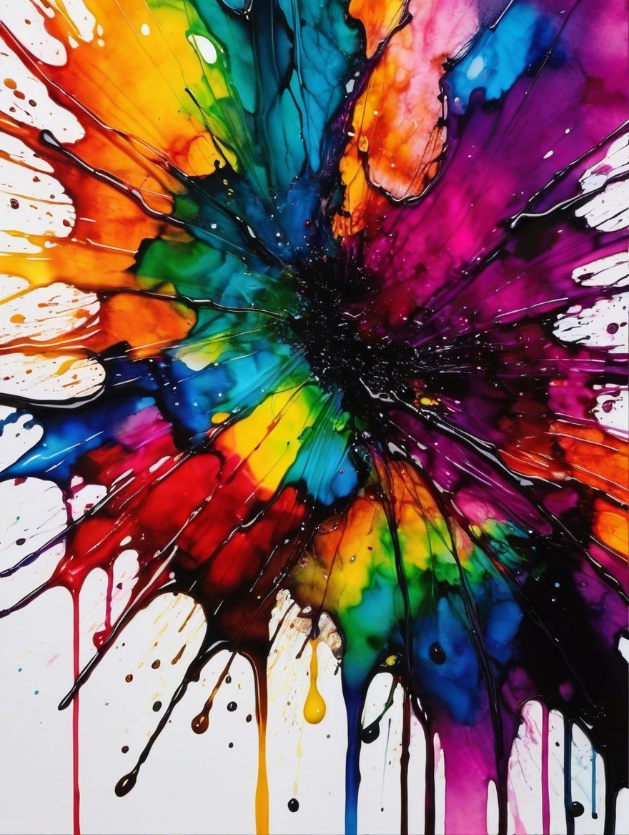 A vibrant, surreal artwork features a woman lying back as a burst of colorful splashes emanates from her. The hues blend beautifully, creating a dynamic contrast against her serene expression.