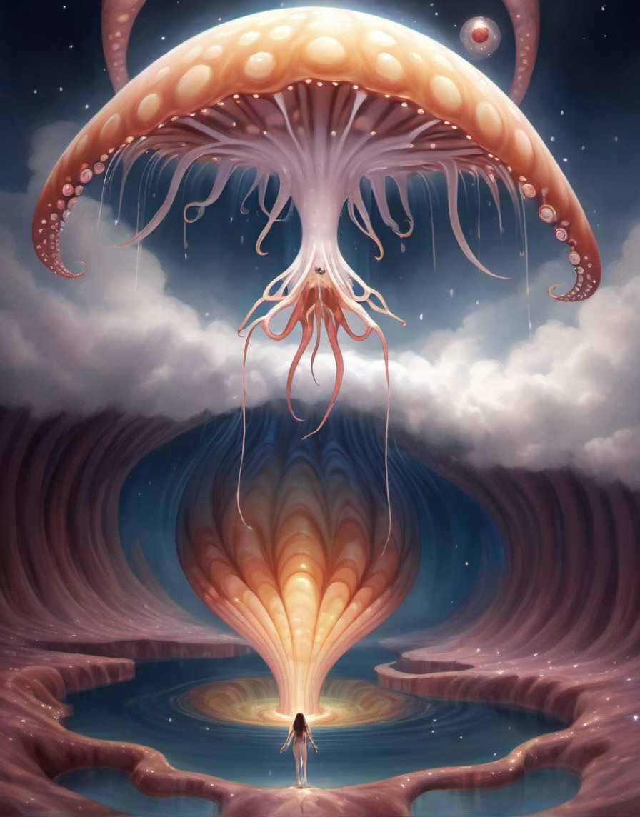 Prompt: start from a single point and incrementally grow an ebullient organically inorganic creature composed of highly-probable impossibilities while depressed hedonauts jump in jubilation as a rhythmic wave function of love and ambivalence pours over the particle duality of light extolling sensate numbness creeping upward as octopi return to their mountainous spawning pools by volcanic suboceanic vents