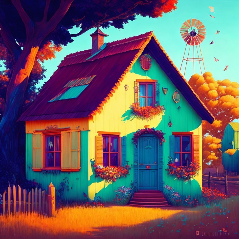 Prompt: "A old farm house with a windmill, teal and orange, stunning details, matisse, esao Andrews, Ivan Bilibin, Rembrandt van Rijn, Jacek Yerka, Daniel Merriam and Catrin Welz-Stein and Carne Griffiths"