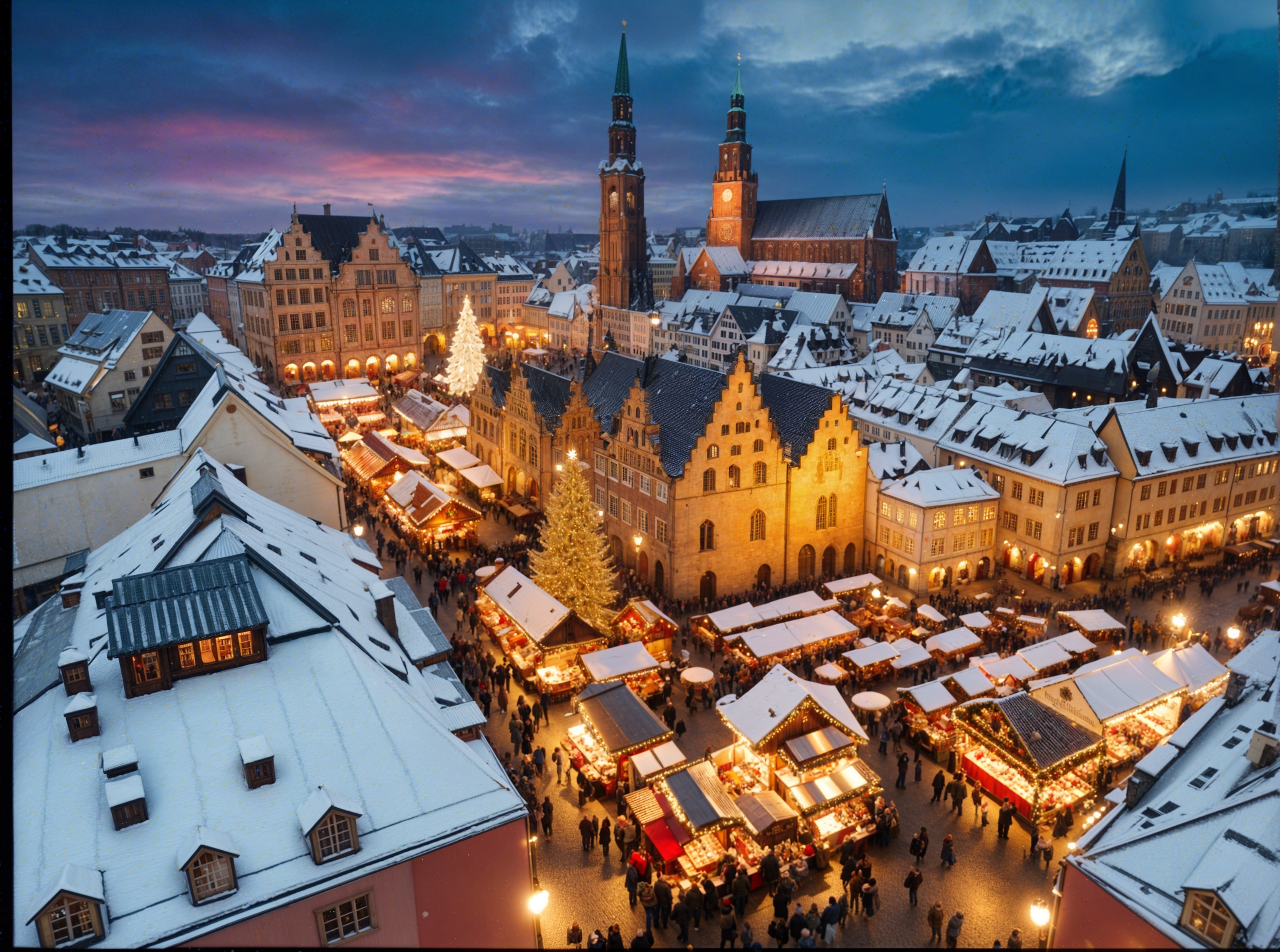 A picturesque winter scene of a festive market, featuring charming stalls illuminated by warm lights, surrounded by historic architecture and a snowy landscape under a twilight sky.