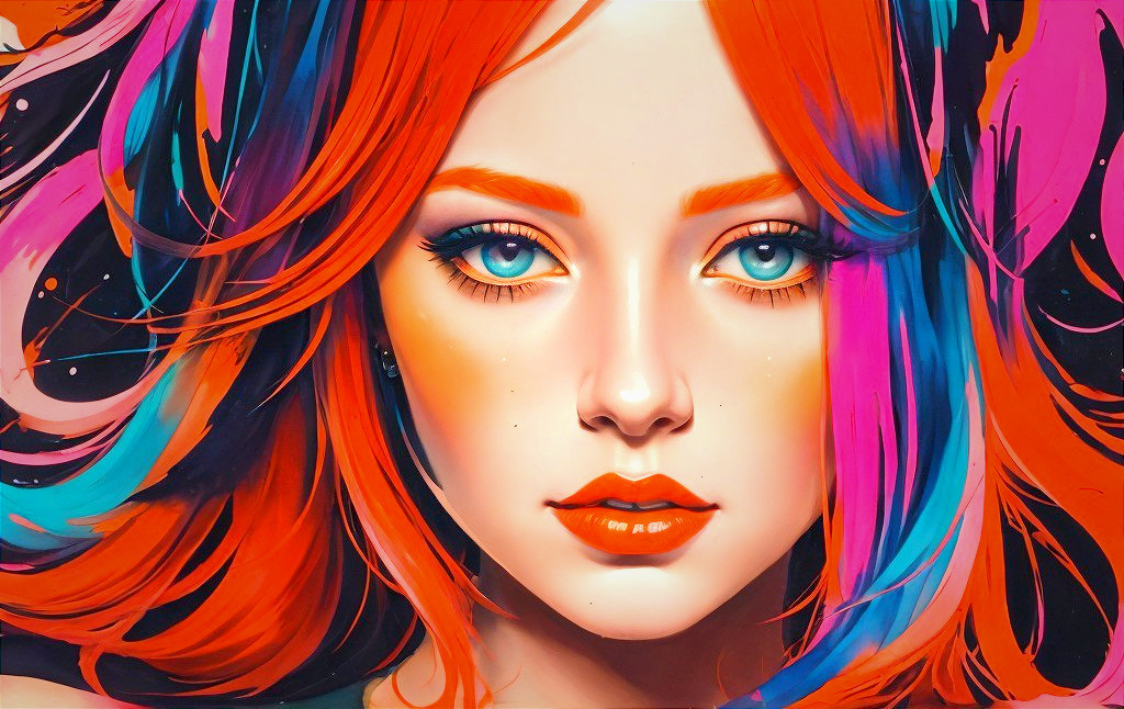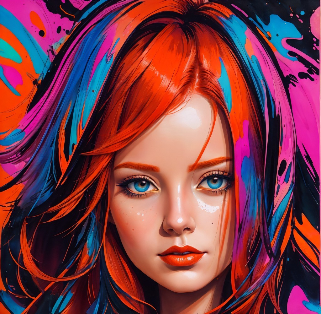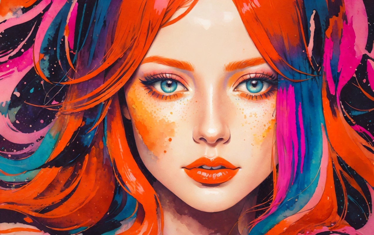 ink and watercolor portrait of a young woman with red hair, spiritual essence, encaustic strokes, fauvistic cuts, tints of pointillism art, tints of comical sketch art, detailed ornamental features, triadic color scheme orange pink blue, vector 9:5, colorful yam, strict anatomical accuracy, moody, synthetic essence, cuteness, maximalism, pop art, radiance, anisotropic filtering 1.7, raytraced shadows 1.8, chiaroscuro lighting, ambient occlusion 1.5, fauvistic cuts, detailed lineage forms, triadic color scheme red purple blue, very stylized illustration 1.8