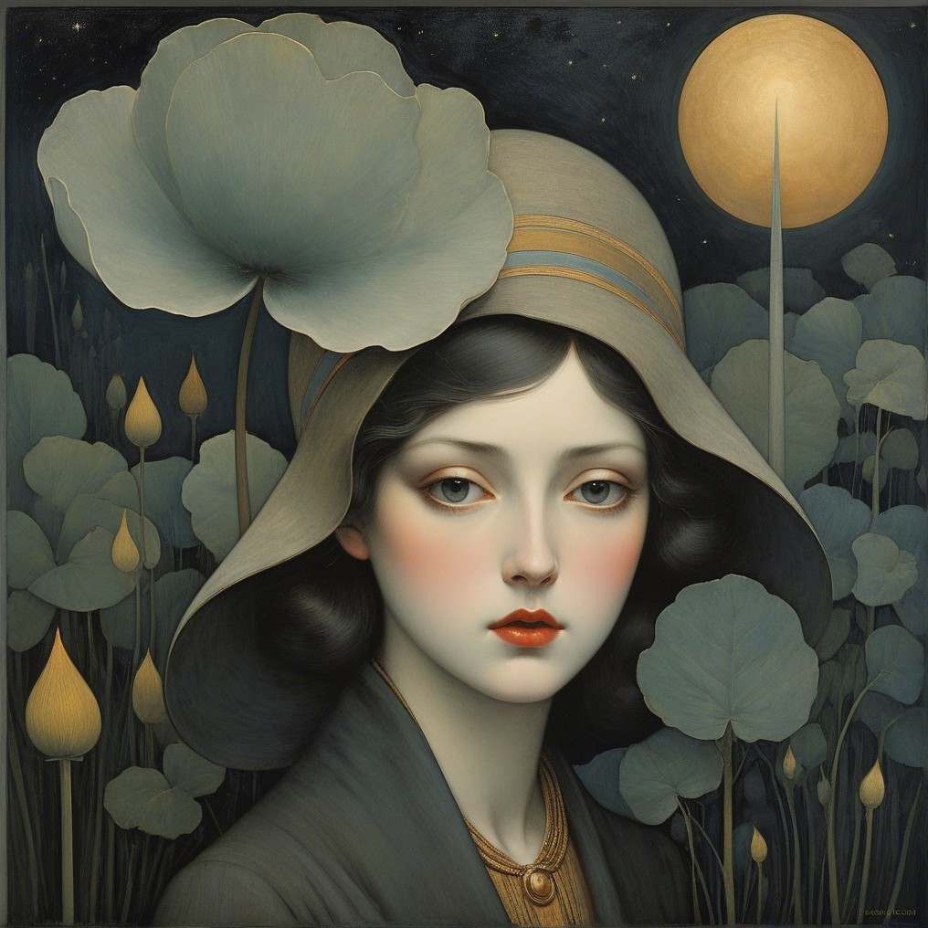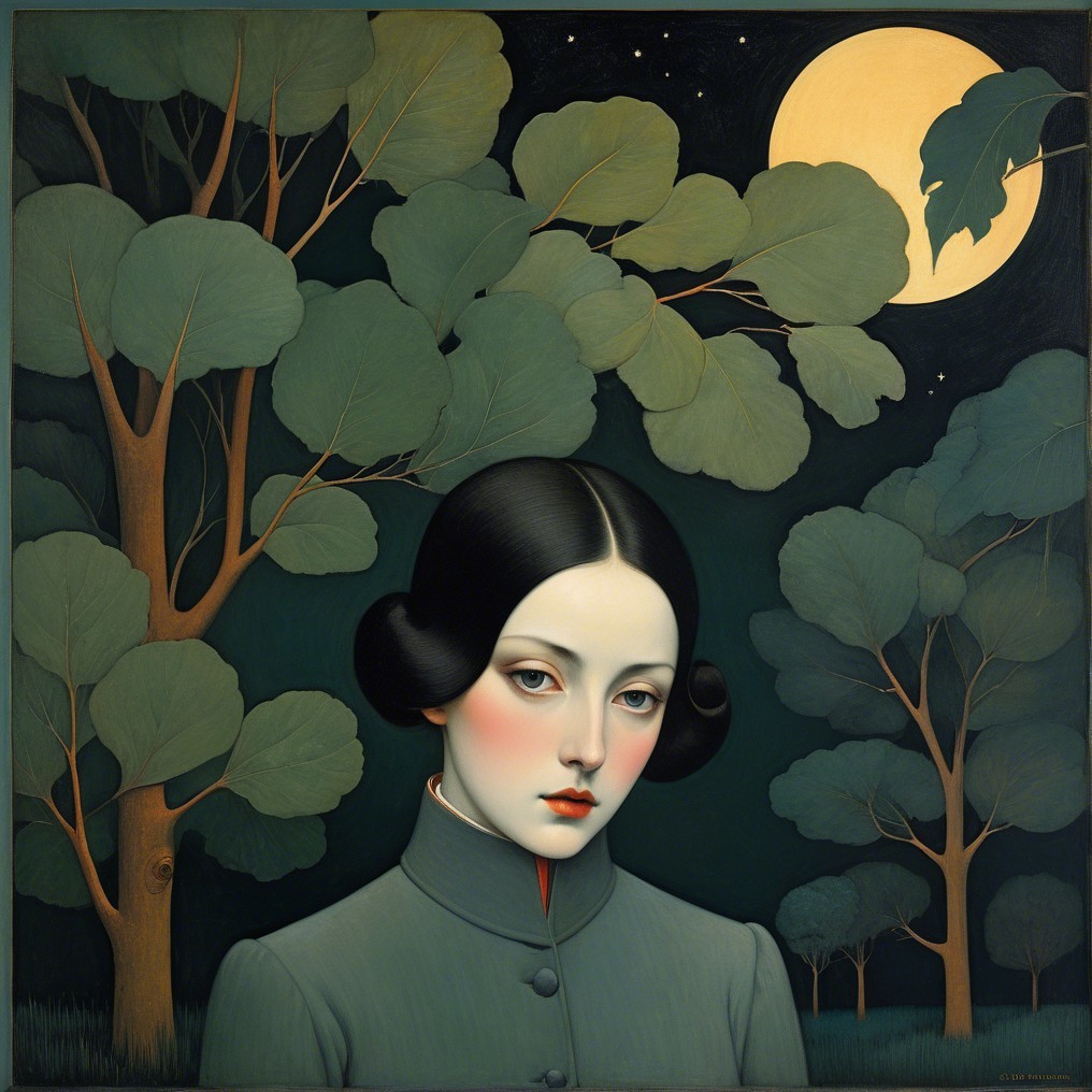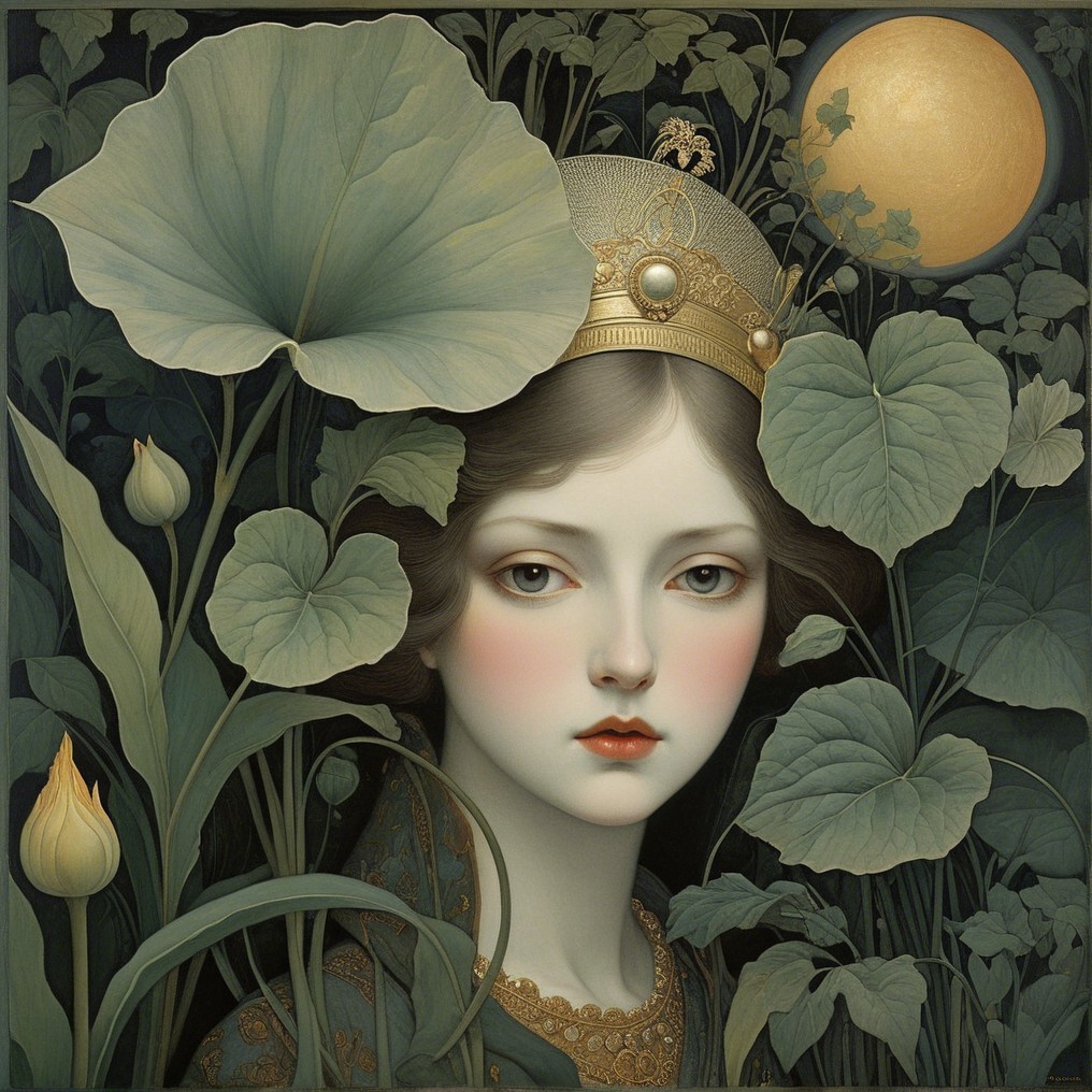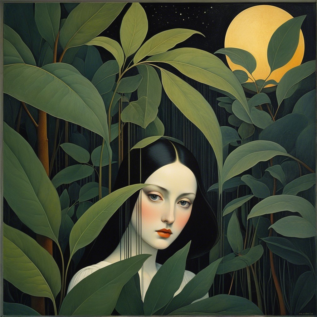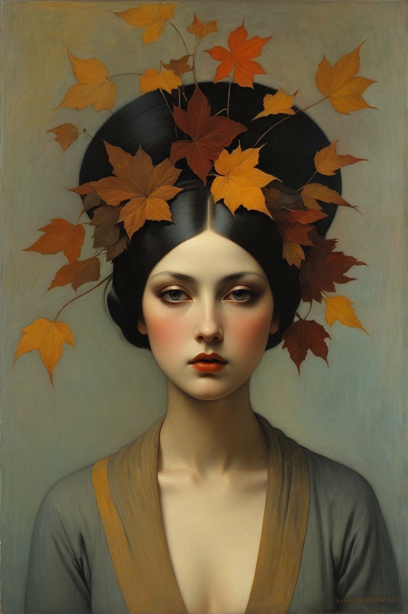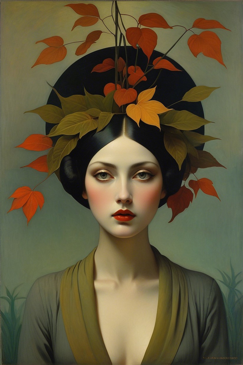A serene woman with an elegant, dark hairstyle adorned with vibrant leaves. She has a gentle expression, framed by a lush, green forest backdrop, blending nature and beauty harmoniously.