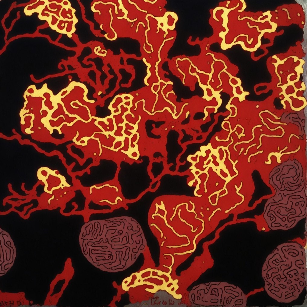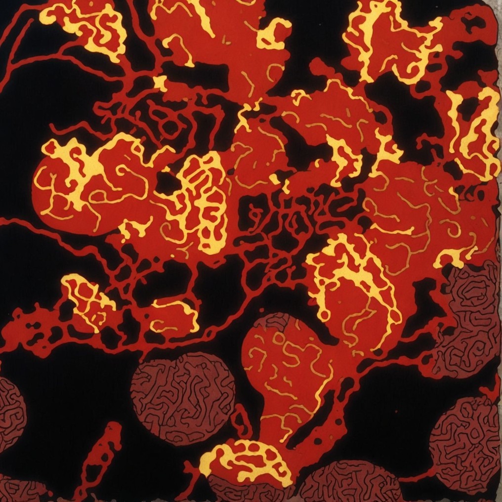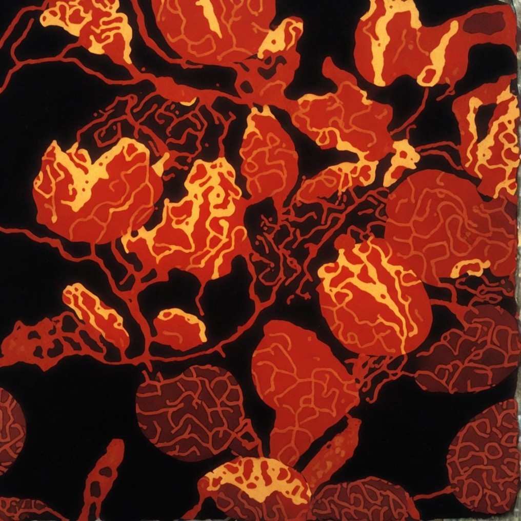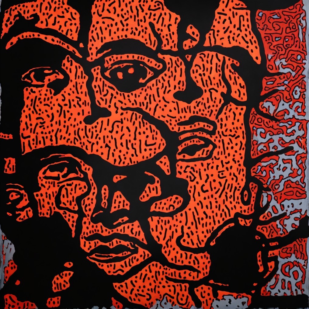 The image features a bold, abstract design of multiple stylized faces interwoven with intricate black lines on a vibrant orange background, creating a captivating and surreal visual effect.
