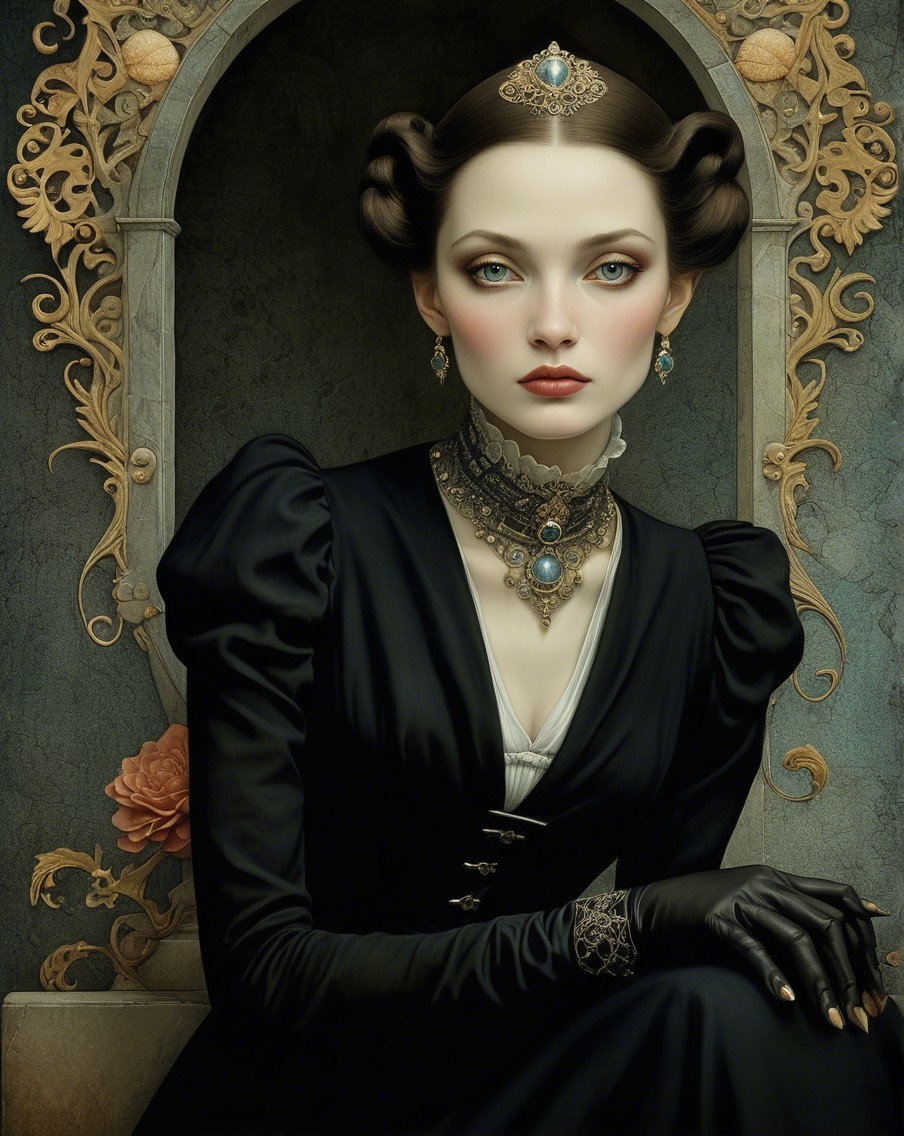 A ethereal portrait of a woman with delicate butterflies adorning her hair. Her serene expression and flowing gown blend harmoniously with ornate floral and whimsical designs in the background.