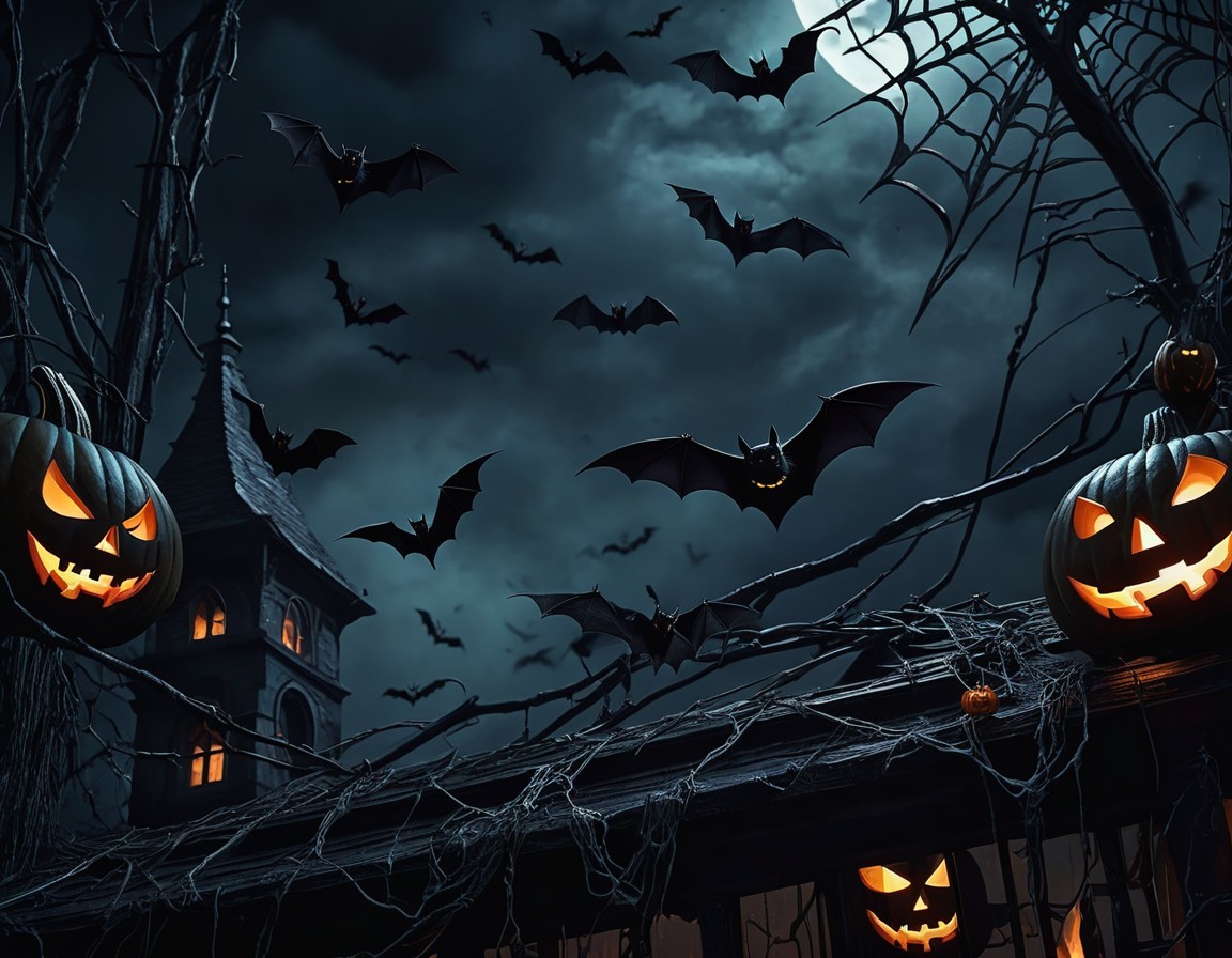 A spooky Halloween scene featuring a haunted house, glowing jack-o'-lanterns, and flying bats against a dark, moonlit sky filled with eerie clouds and spider webs.