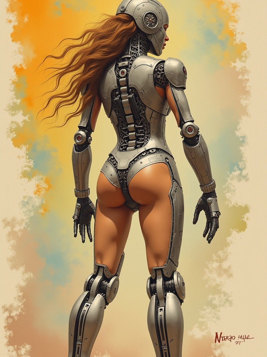 Prompt: "Vintage Alberto Vargas pulp art in action full body mech atompunk standing in realistic watercolor tones. Vintage Alberto Vargas pulp art in action A heavy metal oil dirt graffiti background portrait of a cybernetic woman science fiction It features intricate details, hyper-detailed perfection, very detailed 4k resolution, detailed textures, sharp focus, ultra-high pixel precision, high-quality intricacy, an incredibly detailed masterpiece, photorealistic professional photography. The artwork incorporates a fusion of futuristic and organic elements, blurring the boundaries between the mechanical and the biological. Every stroke of the brush captures the juxtaposition of cold, gleaming metal alongside warm, lifelike flesh. The artist skilfully balances intricate circuitry with delicate veins, creating a visual symphony of man and machine. The overall composition is a testament to the beauty of technology intertwined with humanity, a true masterpiece that transcends traditional boundaries of art and imagination"