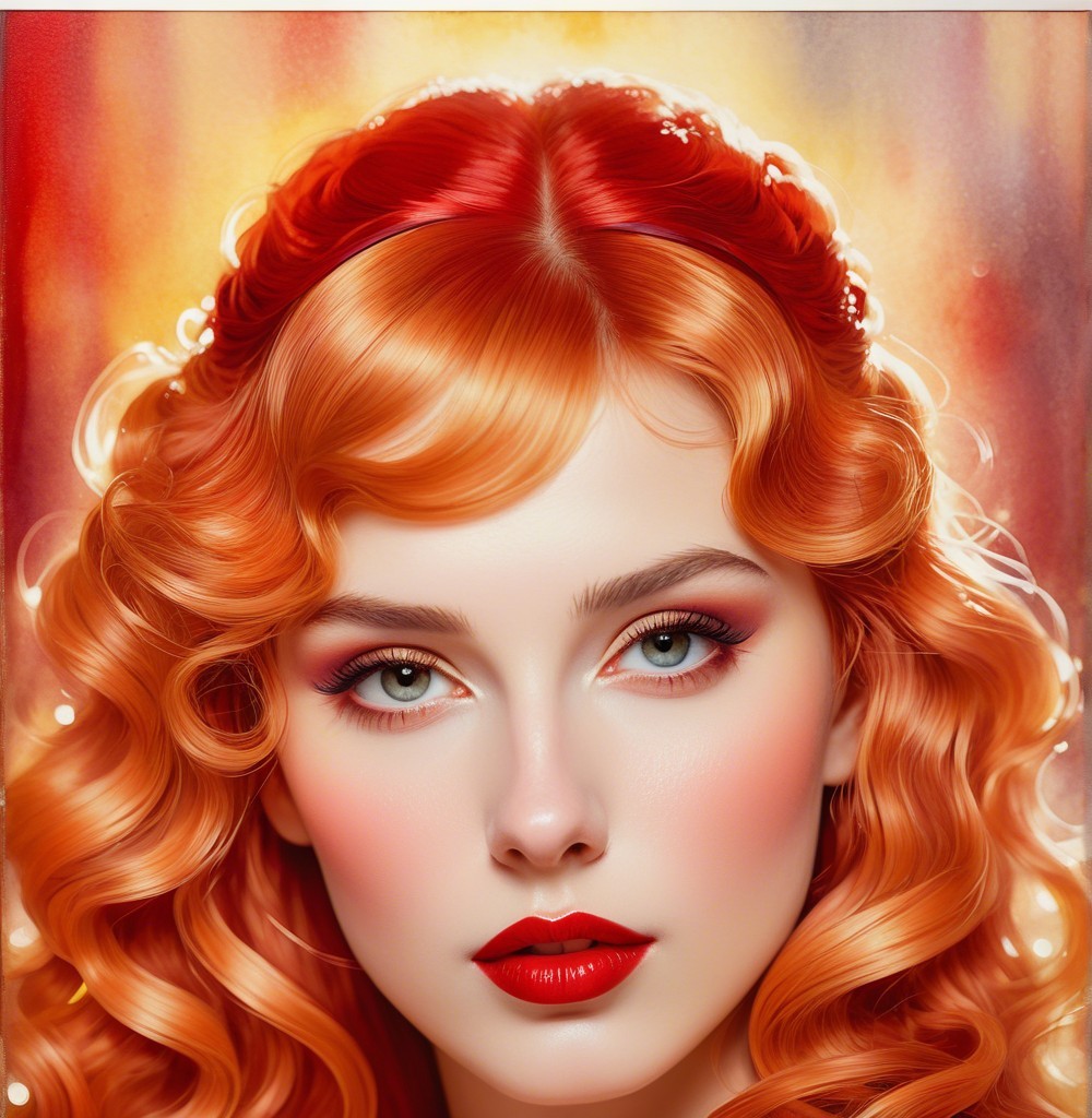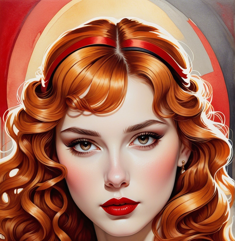 + Prompt:Stylized Art Nouveau portraiture, renaissance style, close-up image of an captivating female enchantress with curly hairbangs. Background with blurry highlights. Pale skin, sunny, sharp, alluring , highlighted by mysterious gleam. Black full lips, hues painted in a deep, glossy red, bold strokes, contouring outlines, mystical, complexion 1.4, flowing hair illusion, parallax occlusion 1.2, raytraced shadows 1.2, plasticity 1.3, blotting, muscular, sculpted, retrofuturistic, divisionism, quilling, swirly dark fantasy art, gothical organic shapes resembling mythical expression, visionary depth, spiritual appearance. The background features a soft, nebulous blend of red and auburns, possibly suggesting a cosmical ambiance.tints of Georgia O'Keeffe and Overton Loyd and harrison fisher, hues in pastel tones of orange and ochre, beige, plasticity 1.3, hatching, hallucinatory, vaporous rim lighting, brushed paint, baroque, cel-shaded, dethereal, burlesque, romantic abstraction by Frank Fazetta, tiny reflections, vivid illumination, perfect handsface, ornamental details, gothic horror essence, wavy, uhd, hdr, octane render illustration 1.5, Novelty architecture, ambient occlusion 1.5, american gothic 1.3, auracore 1.7, bokeh, headshot, stacked-up perspective, stylized pop art illustration merged with storybook illustration by Barclay shaw and Overton Loyd