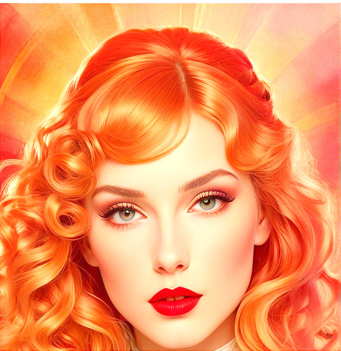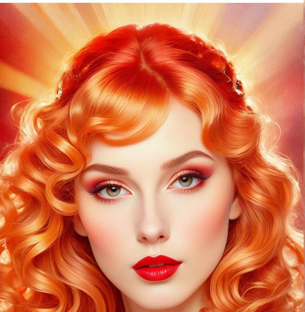 The image features a close-up of a young woman with vibrant red curls and striking green eyes. Her expression is captivating, set against a colorful, circular background that enhances her allure.