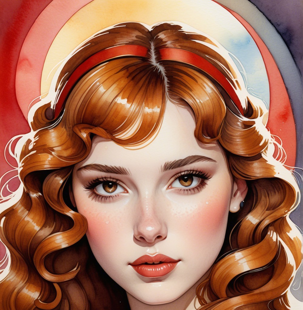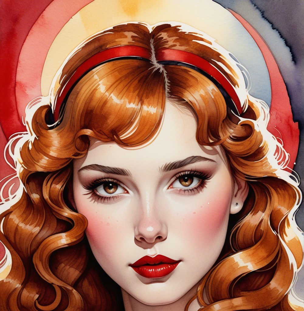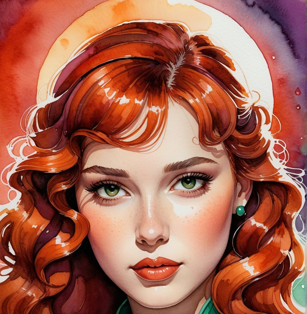 Prompt: Watercolor and ink, wet-on-wet painting, style by el gato gomez, Stylized headshot, stippled, ((renaissance style, close-up, (rim lighting merged with color scheme of lavender, orange red, auburn,, mahogany, emerald, sea green)7:4),visible brushstrokes), captivating, female enchantress with curly hairbangs. Stylization 1.3, octane render illustration 1.5, painted with soft brushstrokes, delicate rounded edges, Background with blurry highlights. Pale skin, sunny, sharp, alluring, blotted paint, highlighted by mysterious gleam. 3d effects 1.8, parallax occlusion 1.5, raytraced shadows 1.8, divisionism, quilling, quaint, cel-shaded, dethereal, dark fantasy inspiration, Black and red lips, hues painted in warm tones of glossy red, stacked strokes, contouring outlines, mystical, complexion 1.4, flowing hair illusion, parallax occlusion 1.2, Abstract, airy, fine lineage, attractive. Loose wavery effects with geometric patterns in yellow and grey, precise fine line drawing, textured patteens, very defined lines, highly detailed ink painting, vibrant colours, rice paper texture, splashes of light orange, red and gold color. 3D brushwork, intricately detailed. Multi-layered patterned linework by sam Toft, harmonious, groovy, grunge, bokeh, stacked-up perspective, stylized pop art illustration merged with storybook illustration by Barclay shaw and Overton Loyd and cabral and Mike Zeck