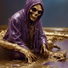A skeletal figure emerges from a glossy, purple substance, its golden arms glistening. It wears a flowing purple headscarf, creating a surreal and striking visual effect.