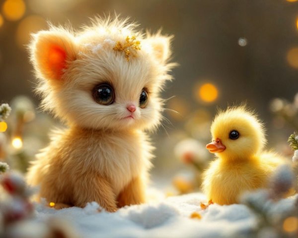 A vibrant LEGO ostrich and a cute duckling stand on a sandy beach, with a picturesque sunset and boats in the background, creating a whimsical and colorful scene.