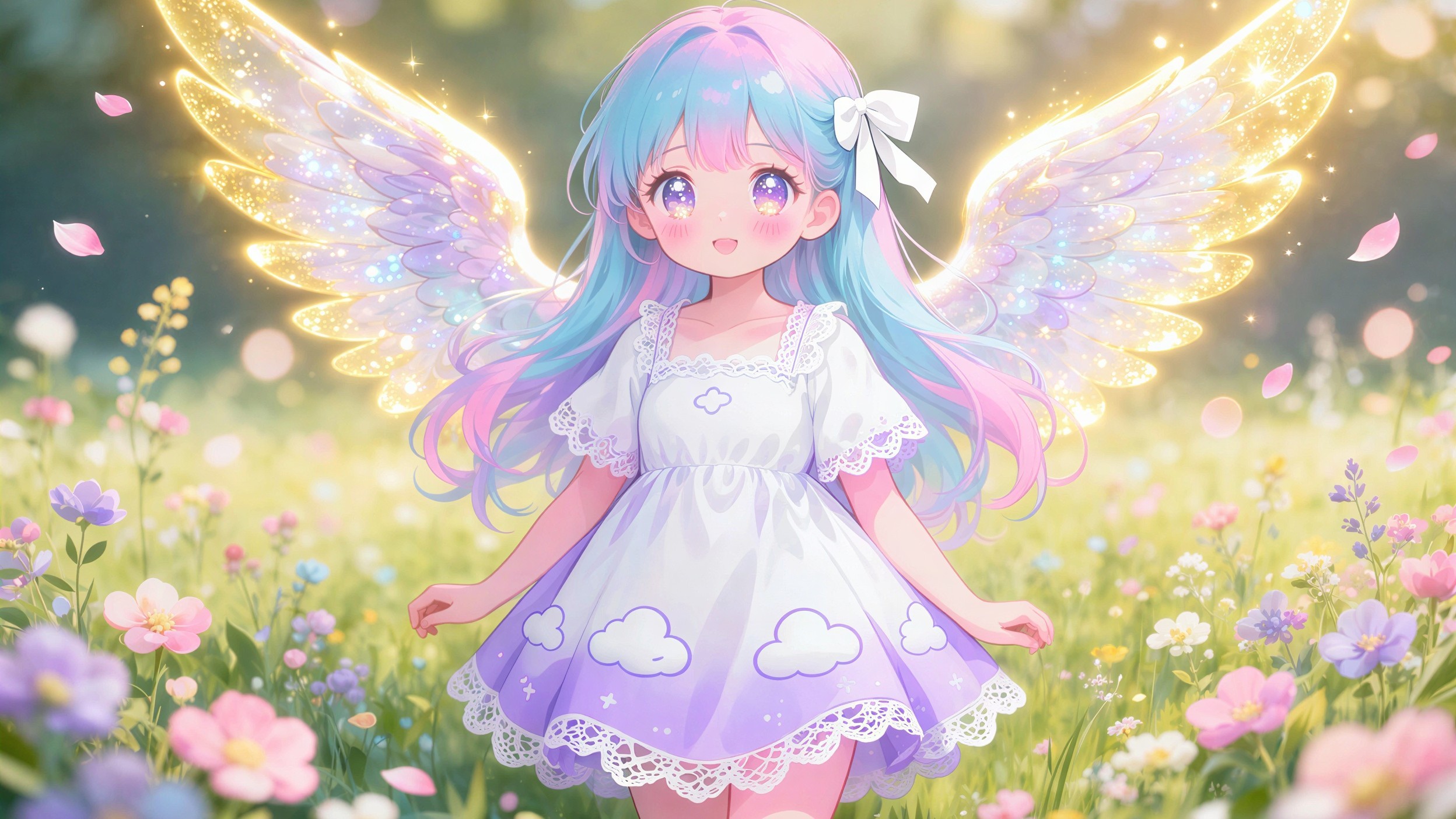 A charming anime girl with delicate, colorful wings stands gracefully, her bright eyes sparkling with wonder. She exudes a playful spirit, surrounded by a whimsical, enchanting landscape.