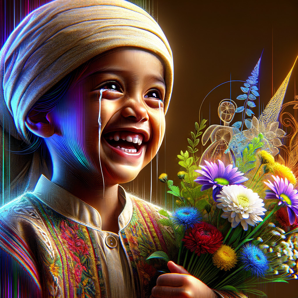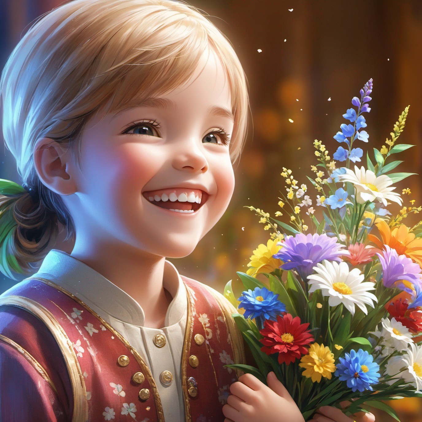 Prompt: Enhance smiling child with flowers. A few tears were glistening on its cheeks. beautiful appearance of its teeth and facial features,epic scenery