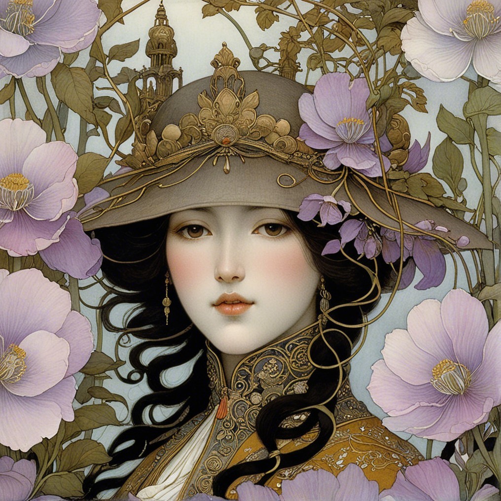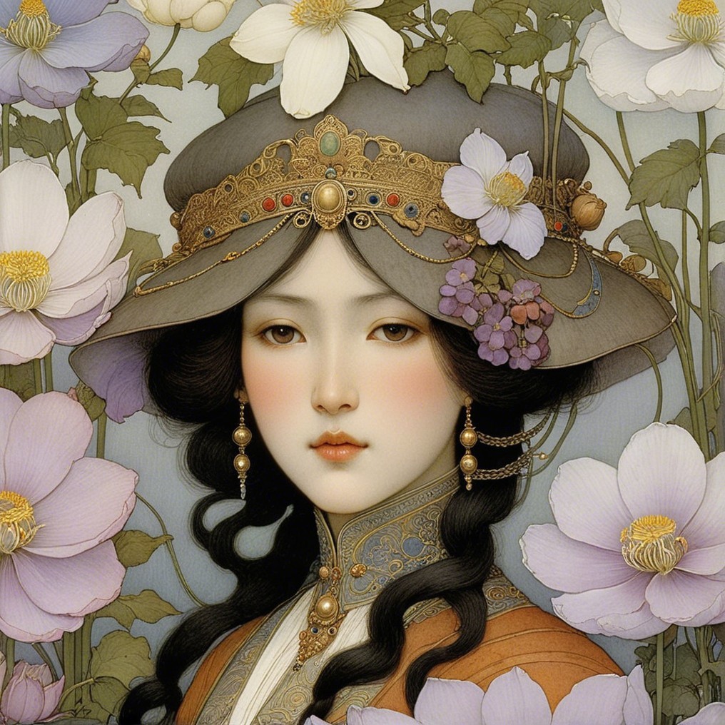 A serene woman adorned with a crown of vibrant flowers and greenery, her dark hair cascading elegantly. She has soft features and a gentle expression, set against a dreamy background.