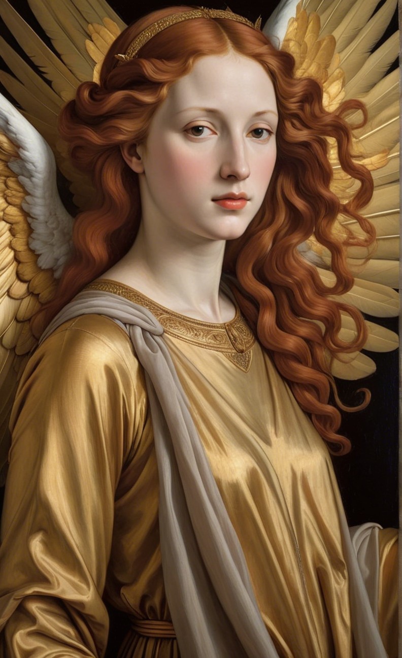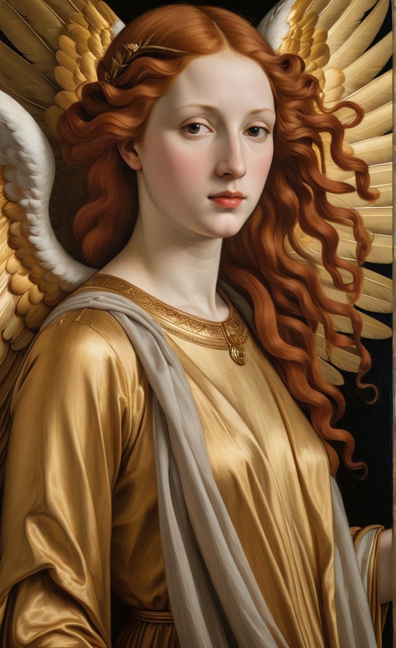 The image features a serene angelic figure with flowing red hair and golden wings. She wears a radiant golden gown, exuding a sense of grace and ethereal beauty against a dark background.