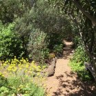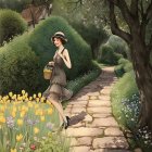 A serene scene featuring a young woman in a flowing dress, holding flowers while walking along a stone path. Surrounded by lush greenery and butterflies, it exudes tranquility and beauty.