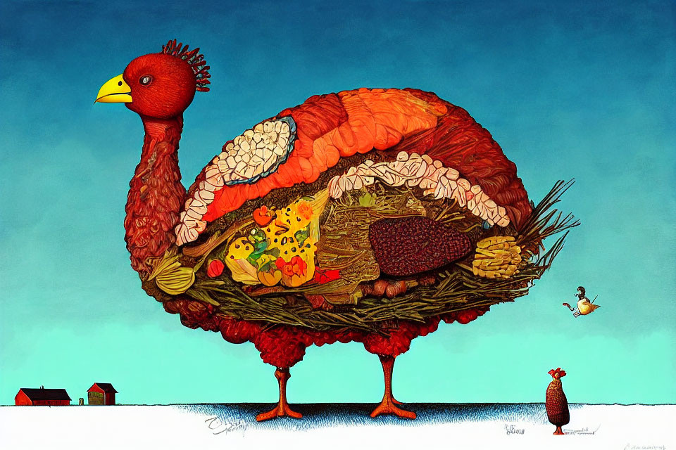 Giant Turkey Made of Foods with Figure and Farmhouse Background