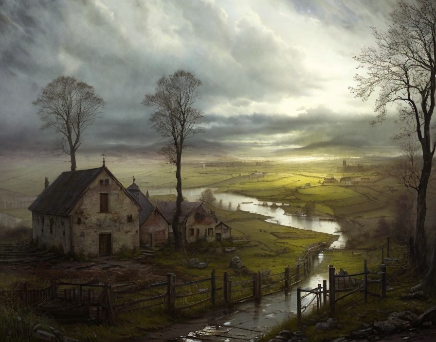 Prompt: Desolate rural landscape, Europe, by Liu Maoshan and John Atkinson Grimshaw, early summer, cloudy weather, watercolor, wet brush effect, intricate, epic, panoramic wide view