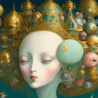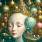 A surreal, ethereal portrait of a serene figure with a smooth, featureless face, adorned with a whimsical landscape of castles, colorful eggs, flowers, and playful animals, all against a rich backdrop.