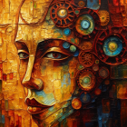 An abstract portrait features a textured face in warm hues, adorned with intricate, colorful gears and mechanical elements, blending human and industrial motifs to evoke a sense of fusion.