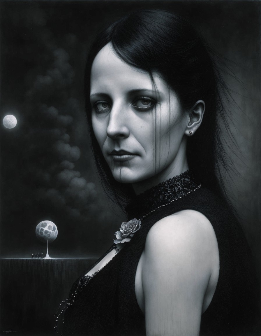 A monochrome portrait of a woman with long dark hair, somber expression, wearing a black dress, with a surreal background.