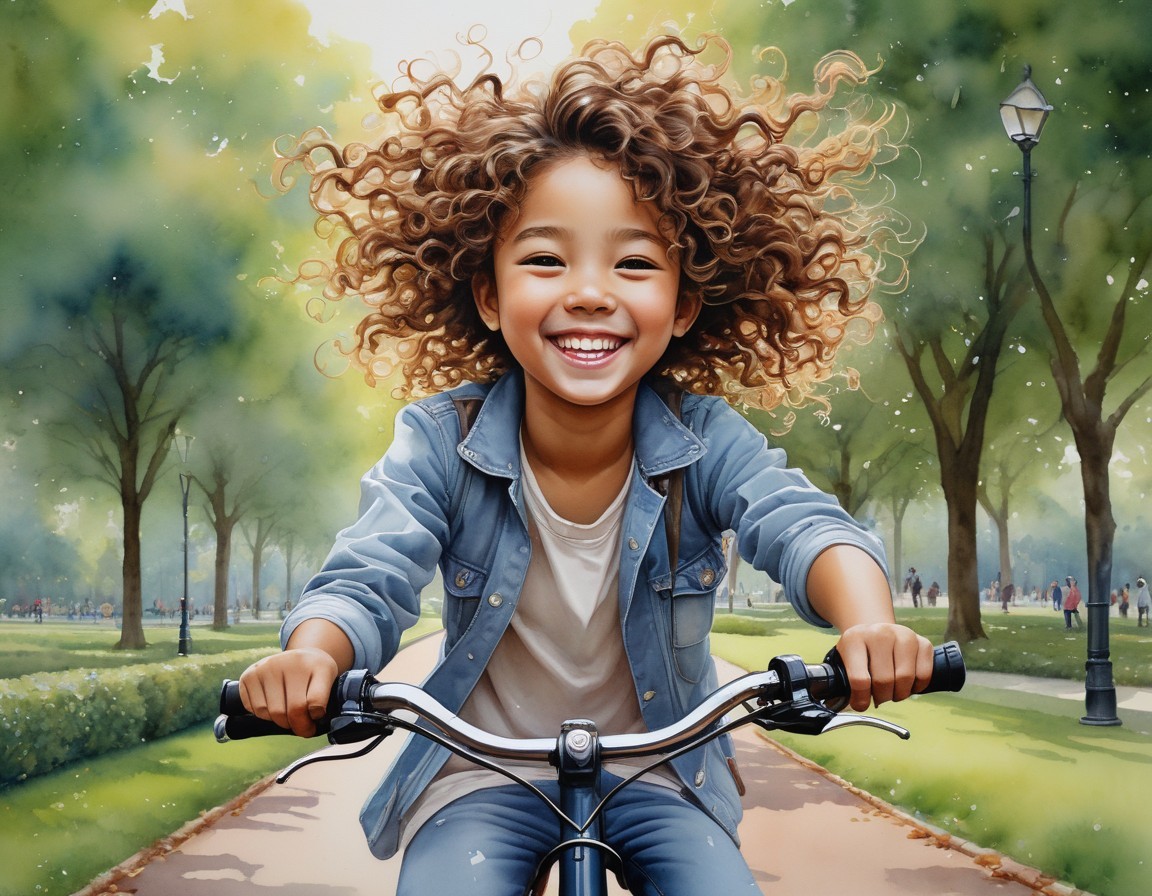 A pretty little gal with a head of curly hair speeds through the park on her bike.