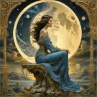 A serene figure in a flowing blue gown sits gracefully on a stone pedestal, gazing thoughtfully at a radiant full moon surrounded by planets, creating a mystical and celestial atmosph