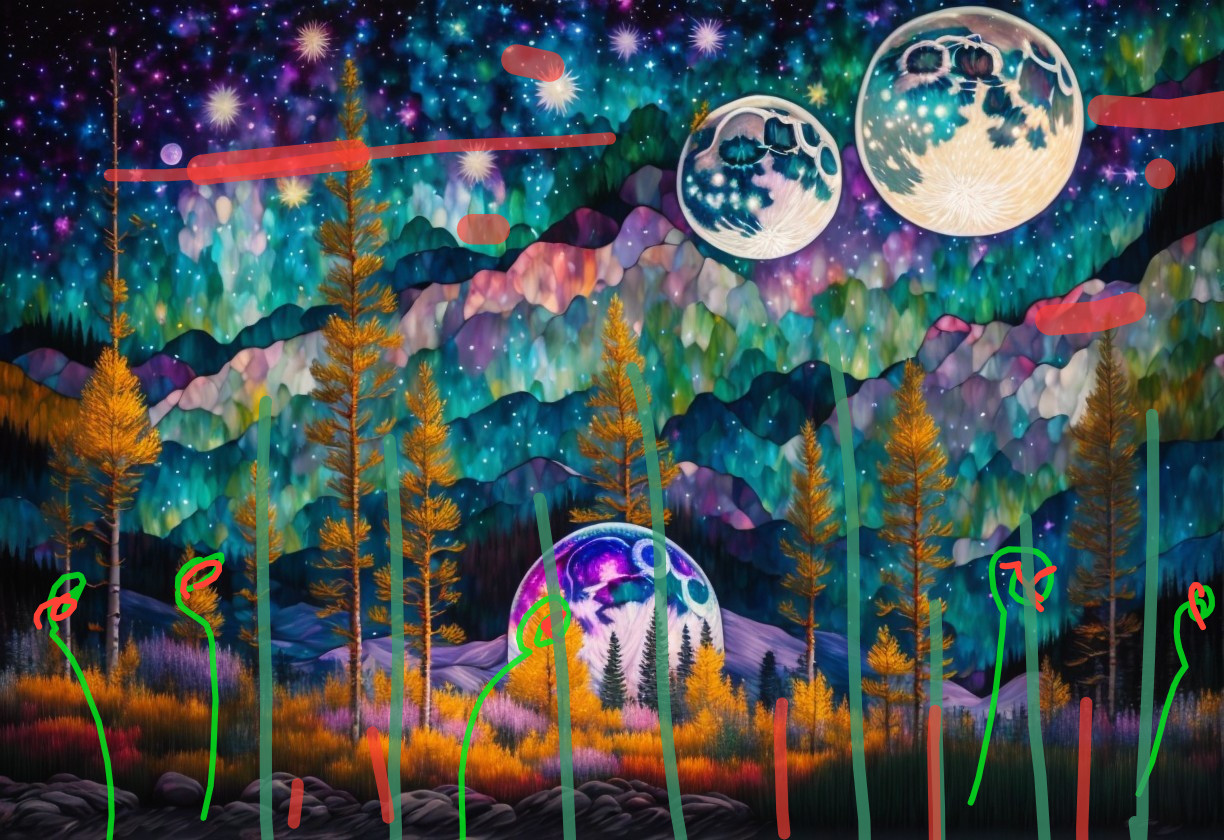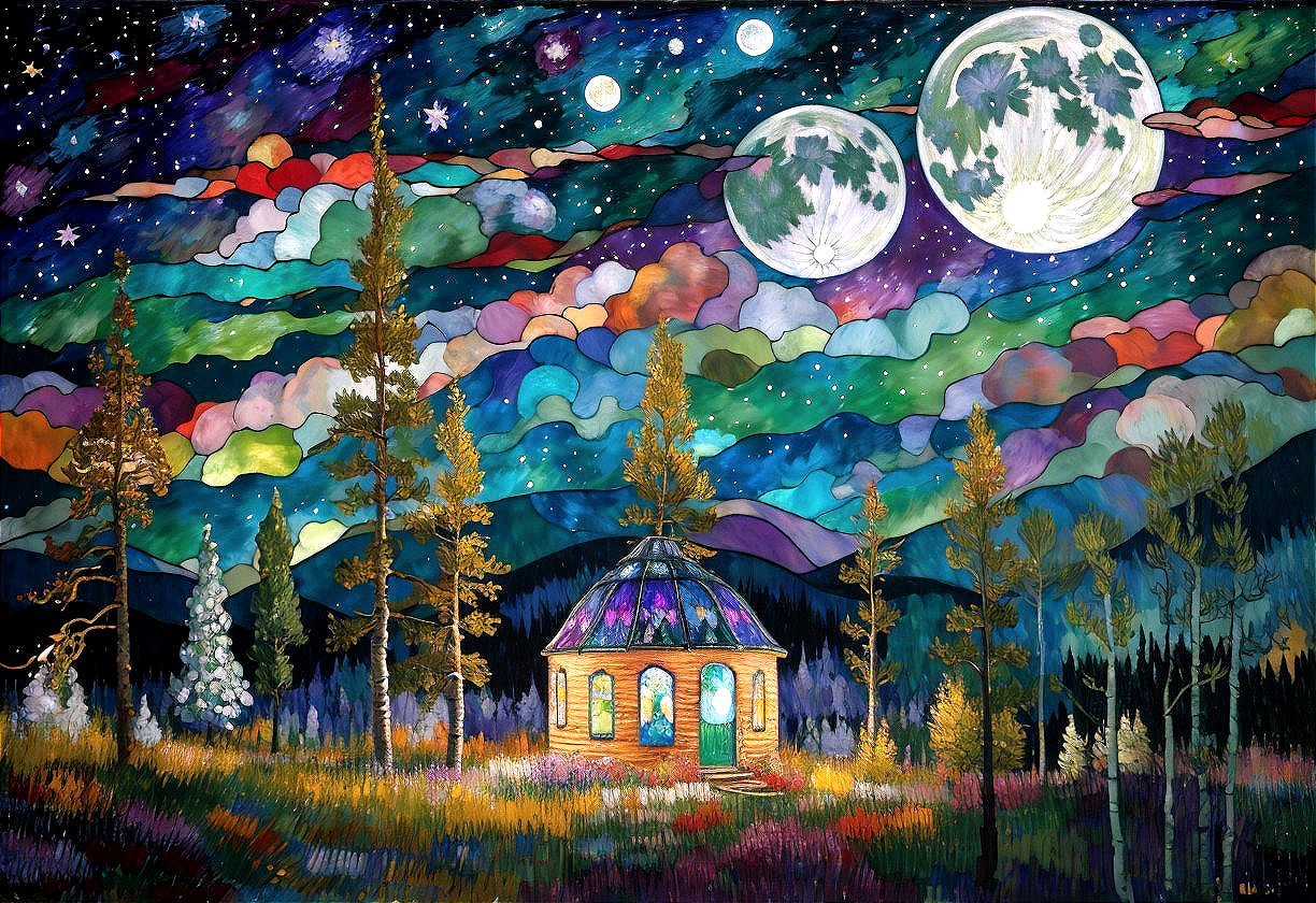 + Prompt:highland flower spectacular, pines and beautiful aspen trees by a river, cosmic night sky with a full bright large moon and stars, made of mixed media, acryllc, stained glass and metallic paints