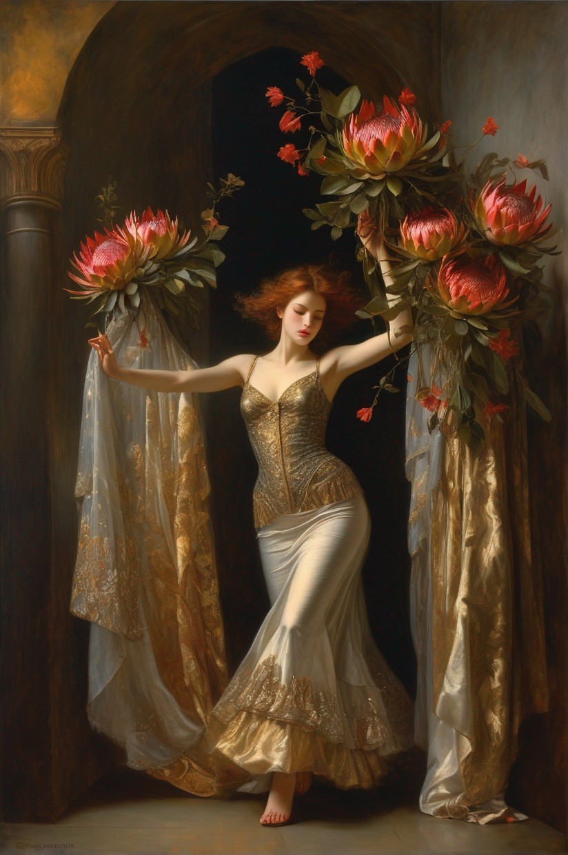 A woman in a flowing white dress holds giant blooming flowers, posing in a classic, ethereal setting with an archway.
