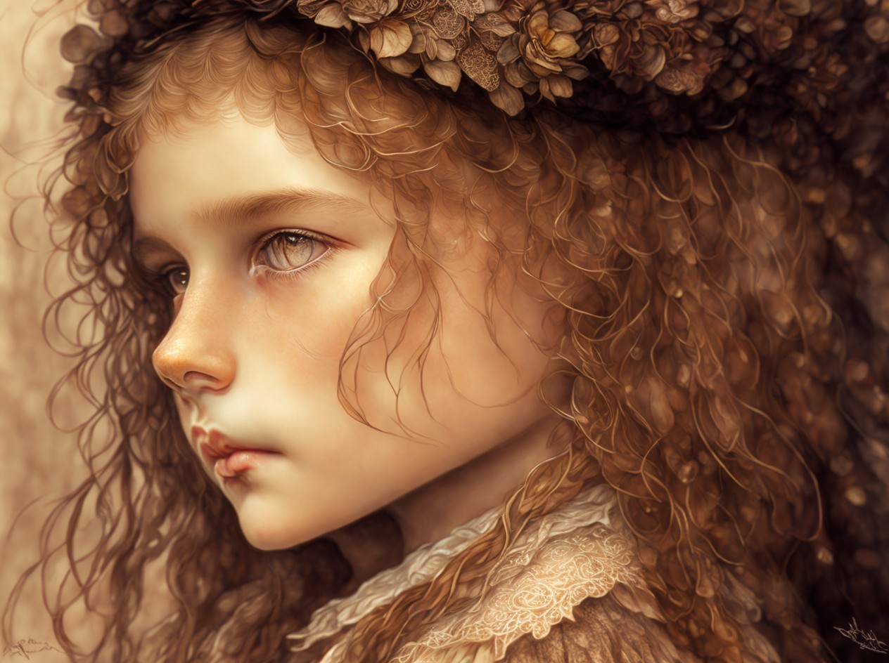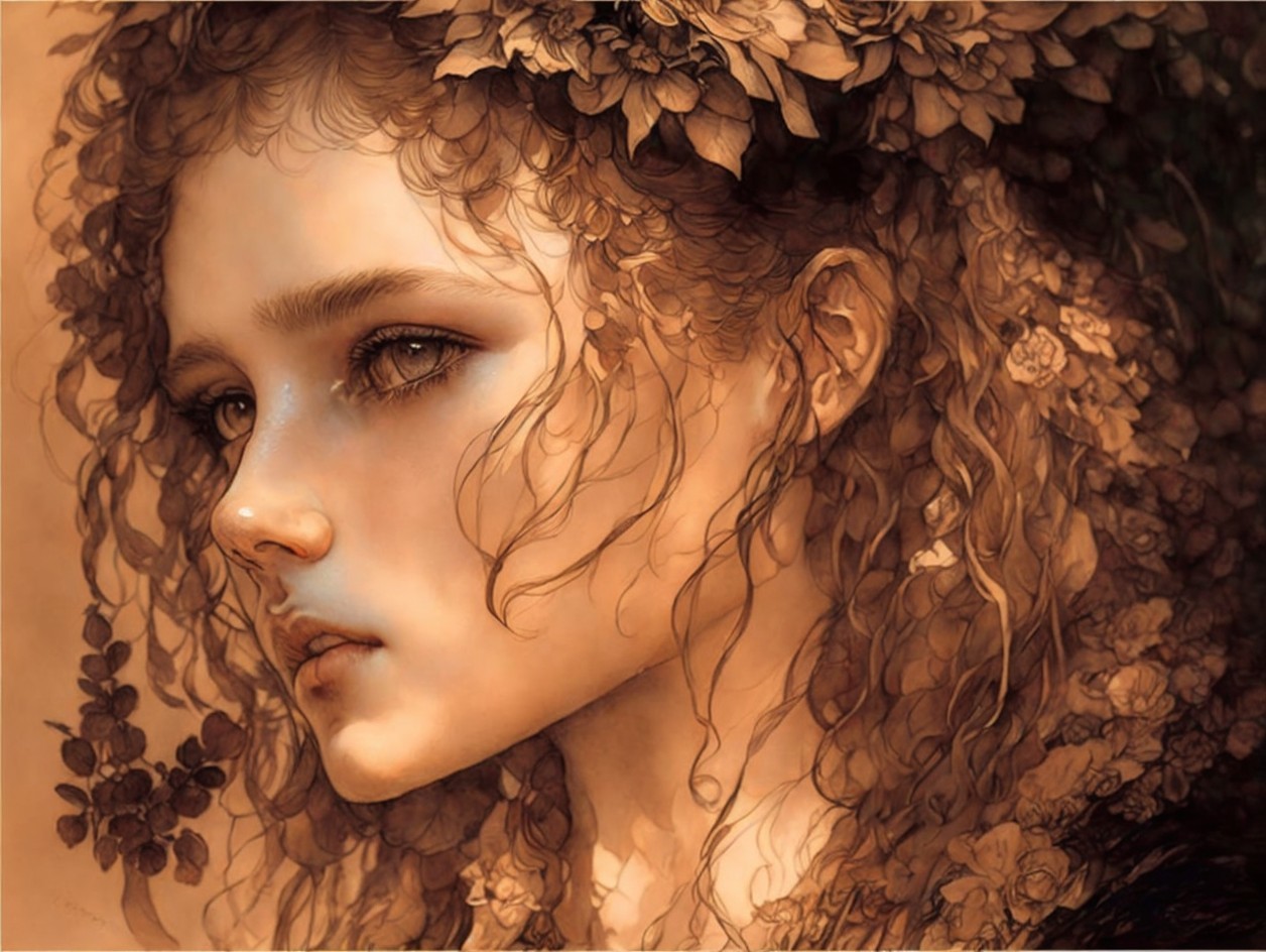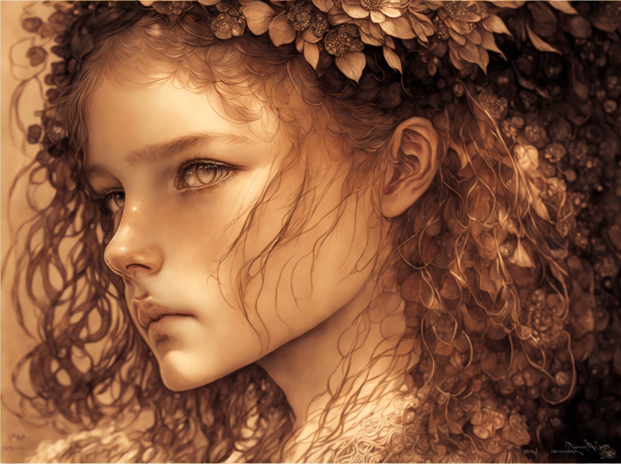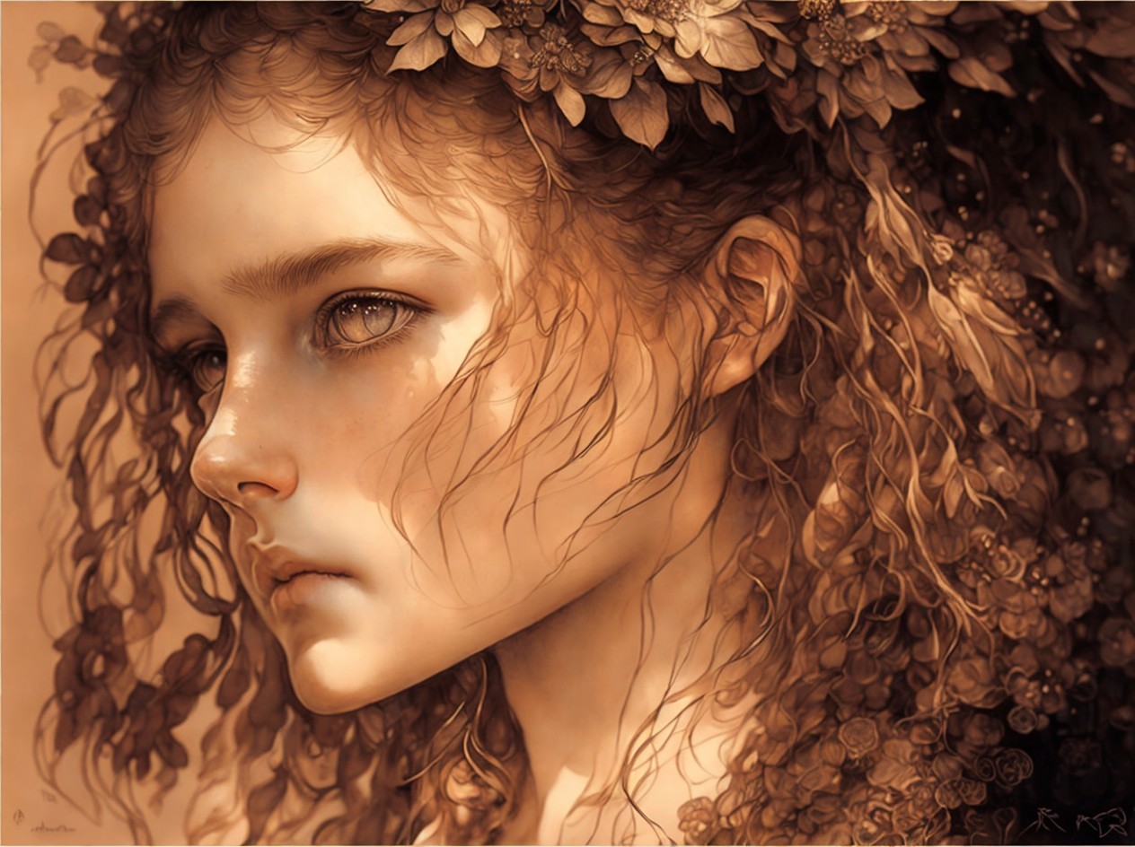 Prompt: An earthy tones line sketch portrait, beautiful face of a young French girl, big brown sparkling eyes, slight smile, fantasy clothes, messy hairstyle, intricate details and precisely drawn cross-hatching lines throughout the drawing, bold lines