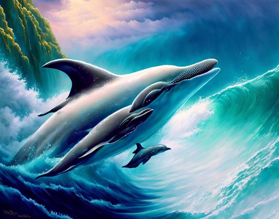 Prompt: "High above the ocean two hands appear out of thin air playing a violin, musical notes drift across the ocean as dolphins arrive through the waves to listen to the music"