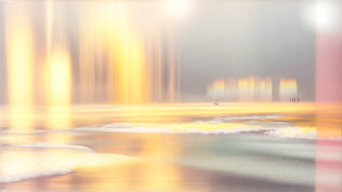 A serene coastal scene features golden light cascading down like waterfalls, with gentle waves lapping at a modern structure against a soft, misty backdrop. The atmosphere is tranquil and ethereal.