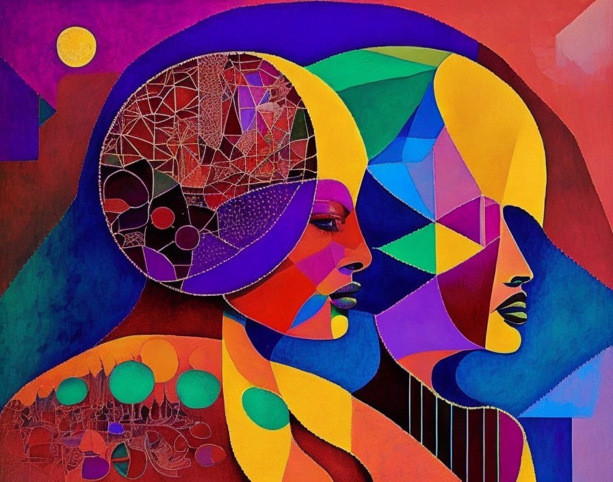 A vibrant, geometric abstract painting featuring two stylized profiles with a complex network of lines in one head.