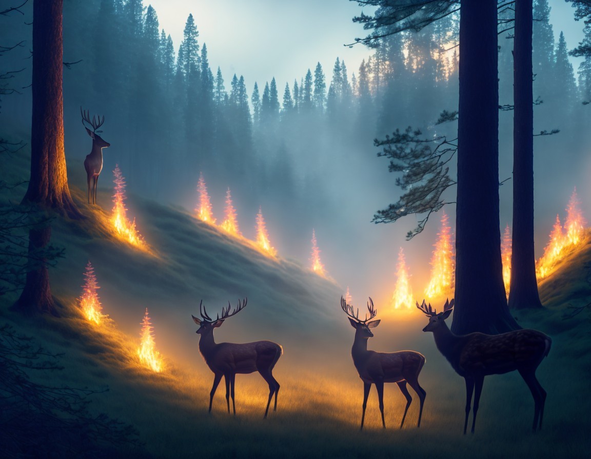 Prompt: Create an image of a mystical forest scene at twilight with a magical aura. In the foreground, a group of beautiful, obviously alarmed deer, lit by reflections of fire, stand alert, casting long shadows on the forest floor. Some deer gaze directly forward with reflective oval eyes while others look to the side, their silhouettes sharply outlined by the backlighting. A few panicked deer leap gracefully through the air. The forest floor is peppered with small, lush green bushes and stray pine needles.