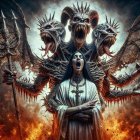 A fierce warrior queen stands at the forefront, adorned in intricate armor and a dramatic crown. Behind her, a massive dragon emerges amidst flames, while ethereal figures flank her.