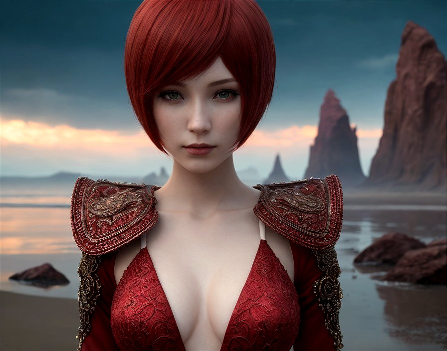 A striking figure stands on a windswept beach, wearing a deep red outfit with ornate shoulder armor. Her short, vivid red hair contrasts with the serene landscape of rocky formations and distant water.