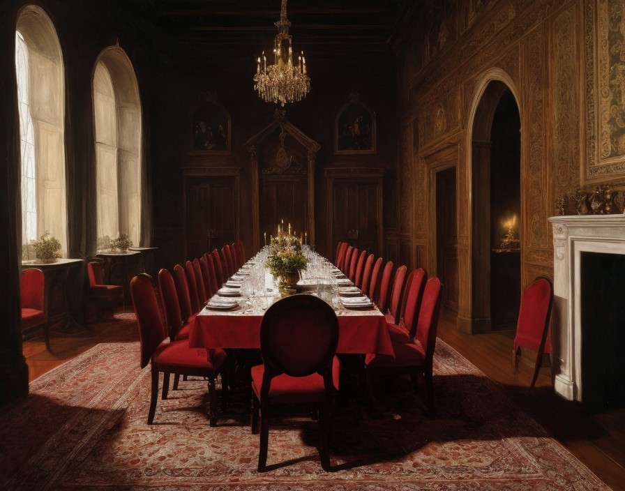 A lavish dining room features an ornate table set with fine china, surrounded by elegant red chairs. Grand chandeliers hang from the ceiling, illuminating the rich, dark decor and intricate details.