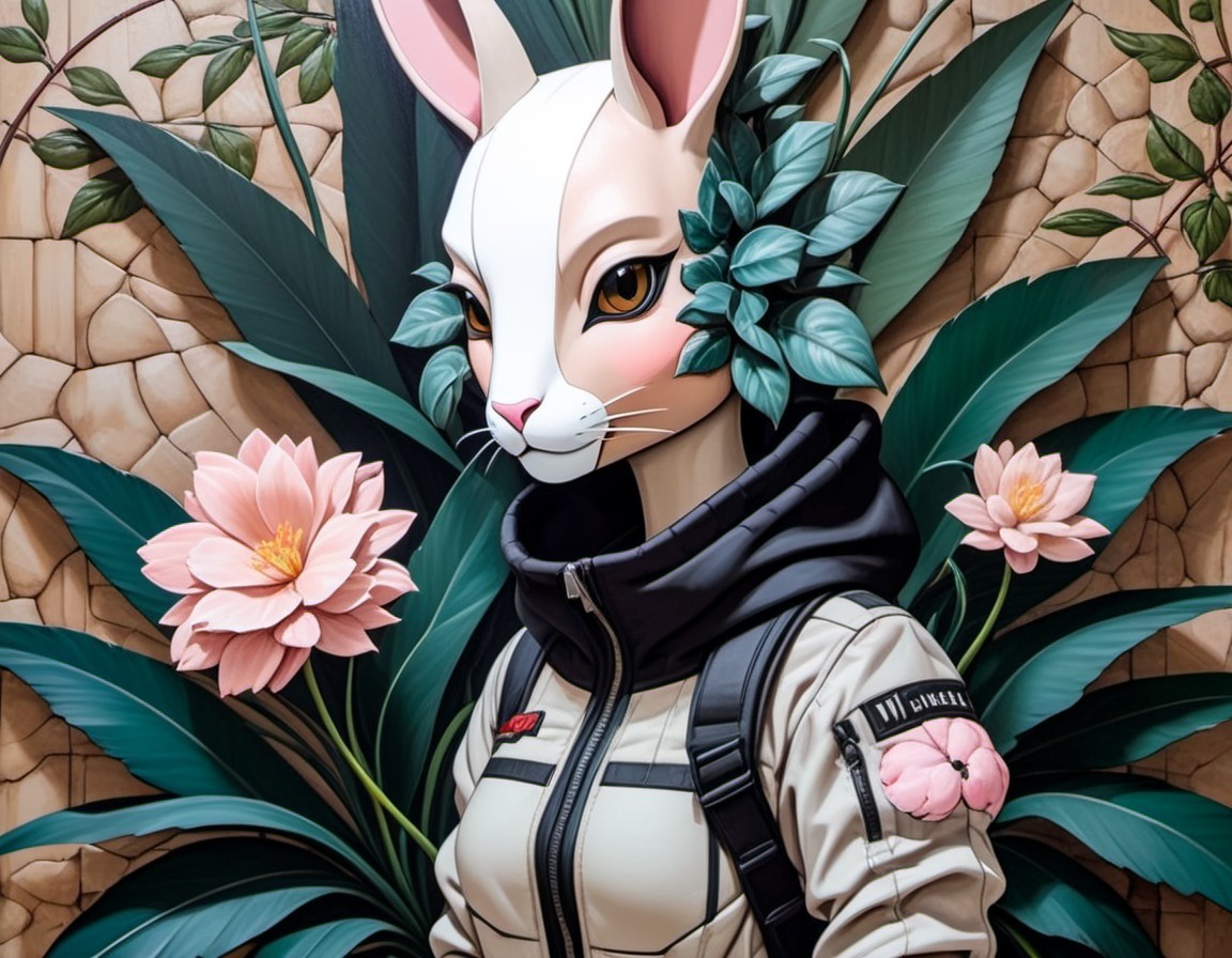 A captivating anime-style character with long blonde hair and bunny ear headphones stands amidst vibrant greenery and flowers, exuding a sense of mystery and charm.
