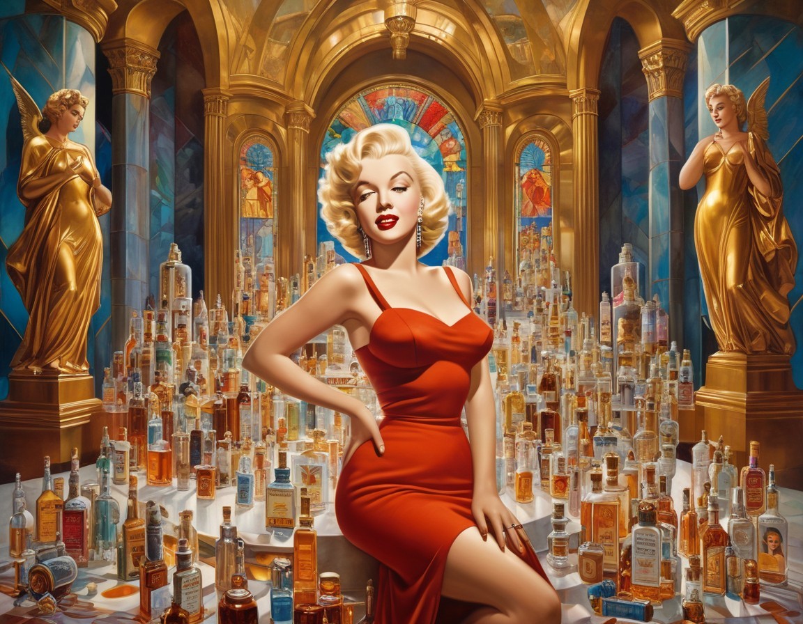 Prompt: Inside the Hollywood Temple of the Great Goddess, Marilyn Monroe; surrounded by stained-glass likenesses of Marilyn, Gargantuan Statues of her in all of her movie star glory, an altar covered in sleeping pills and bottles of whiskey.