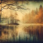 A serene autumn landscape featuring a tranquil lake reflecting vibrant orange and golden trees. Soft sunlight filters through the foliage, creating a peaceful, misty atmosphere.