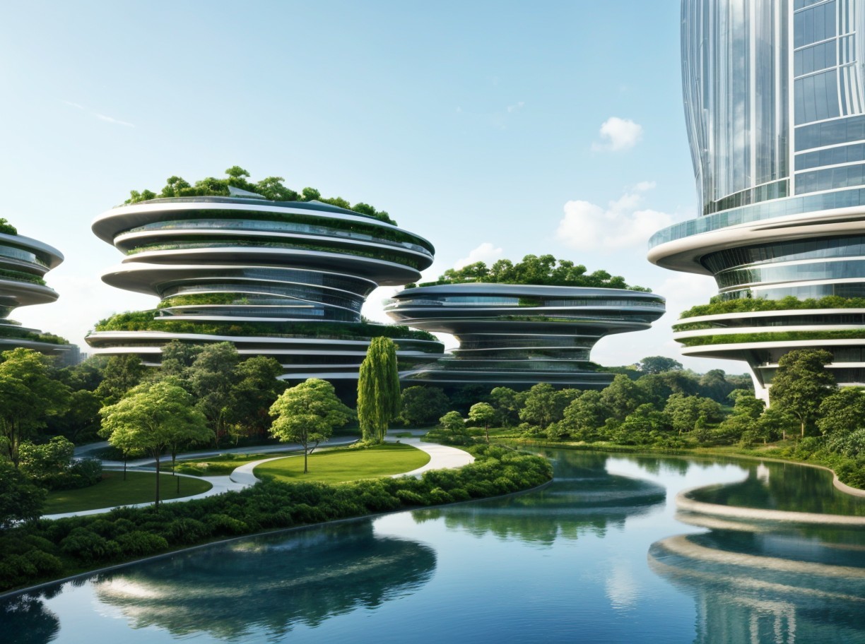 Futuristic architecture features sleek, organic-shaped buildings with green roofs. They’re surrounded by vibrant foliage and a winding waterway, creating a harmonious connection with nature.