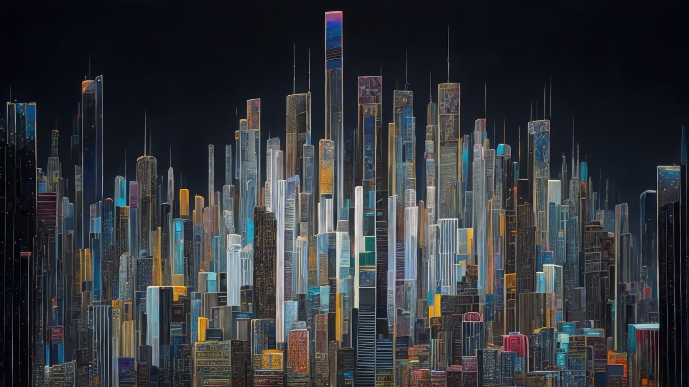 A vibrant, futuristic city skyline with illuminated, colorful skyscrapers against a dark background.