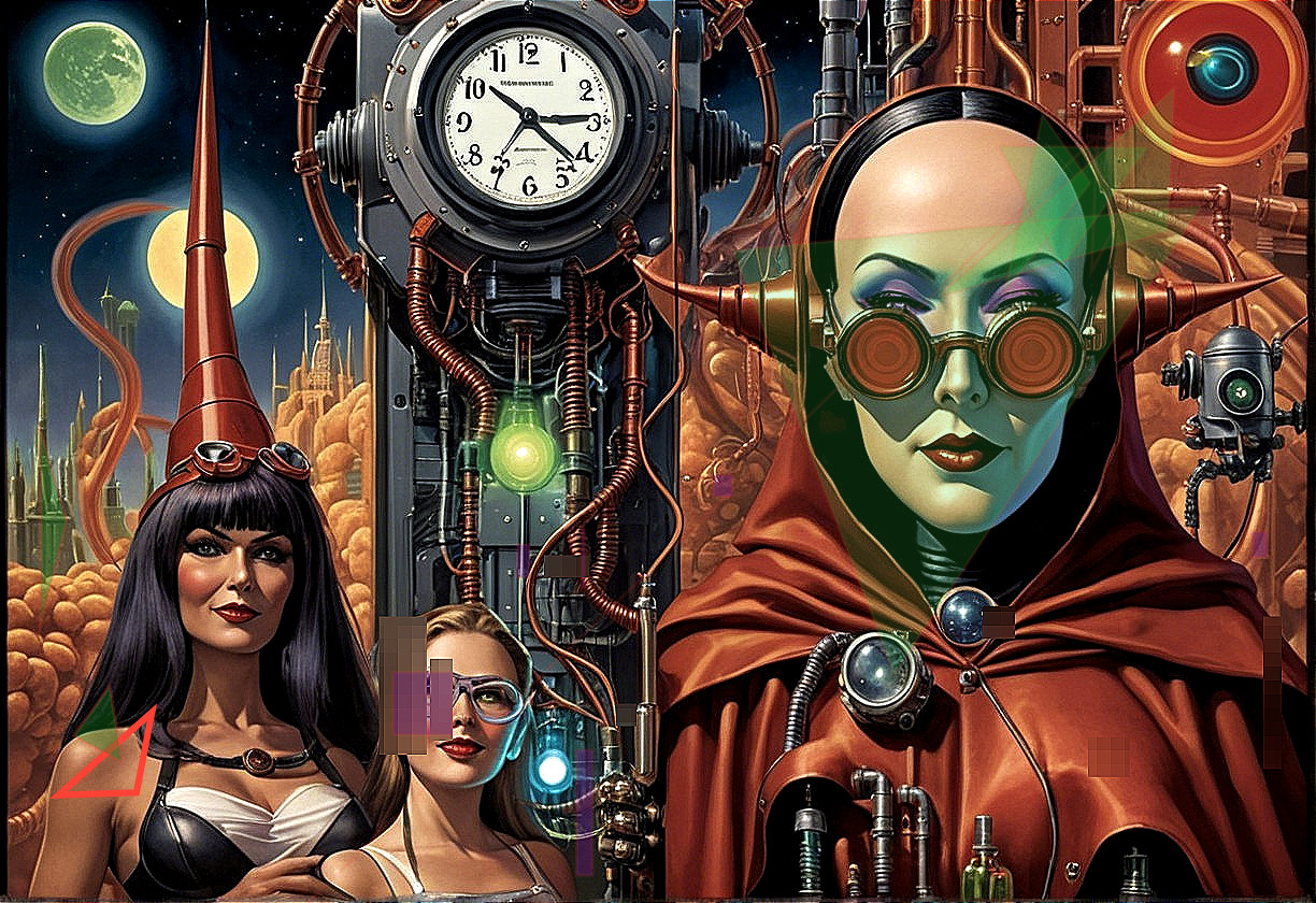 The image features two stylish women in a steampunk setting, surrounded by intricate machinery, clocks, and vibrant colors, evoking a fantastical, retro-futuristic atmosphere.